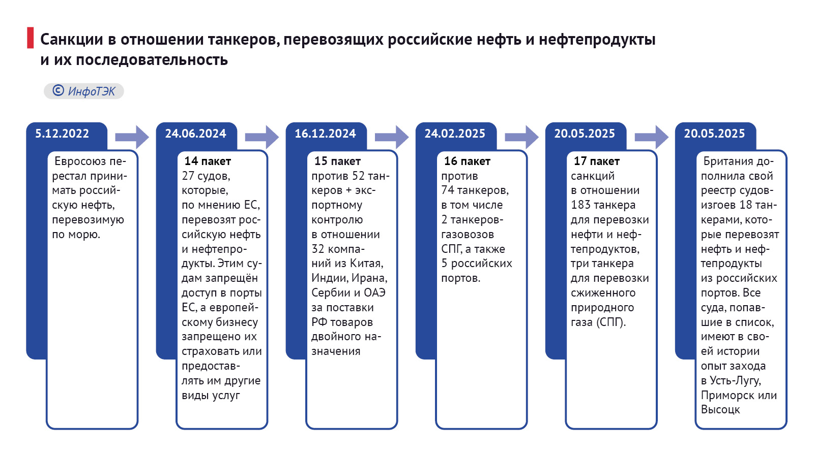 Еврокомиссия 20 мая 2025 года ввела 17-ый пакет санкций, в который включила 189 судов: 183 нефтеналивных, а также три танкера-газовоза СПГ под флагом Мальты, которые подозреваются в работе на проекте Арктик СПГ-2, два судна-тяжеловоза (Nan Feng Zhi Xing под флагом Гайаны и Ocean 28 под флагом Панамы), ранее перевозившие модули для СПГ-завода Арктик-СПГ-2 и одно дноуглубительное судно (драга Tong Yuan под флагом Китая). Несмотря на неэффективность каждого предыдущего пакета санкций, продолжается ввод новых.