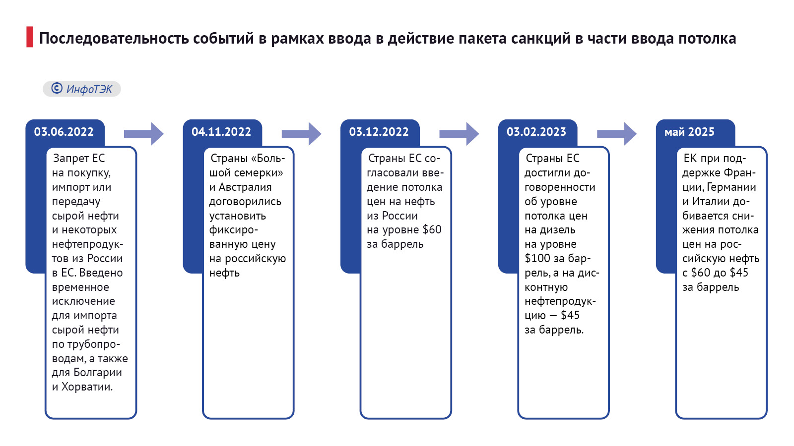 В настоящее время Еврокомиссия при поддержке ведущих государств Европейского союза, включая Францию, Германию и Италию, добивается резкого снижения потолка цен на российскую нефть с $60 до $45 за баррель, но пока не получила единогласной поддержки всех 27 стран сообщества.