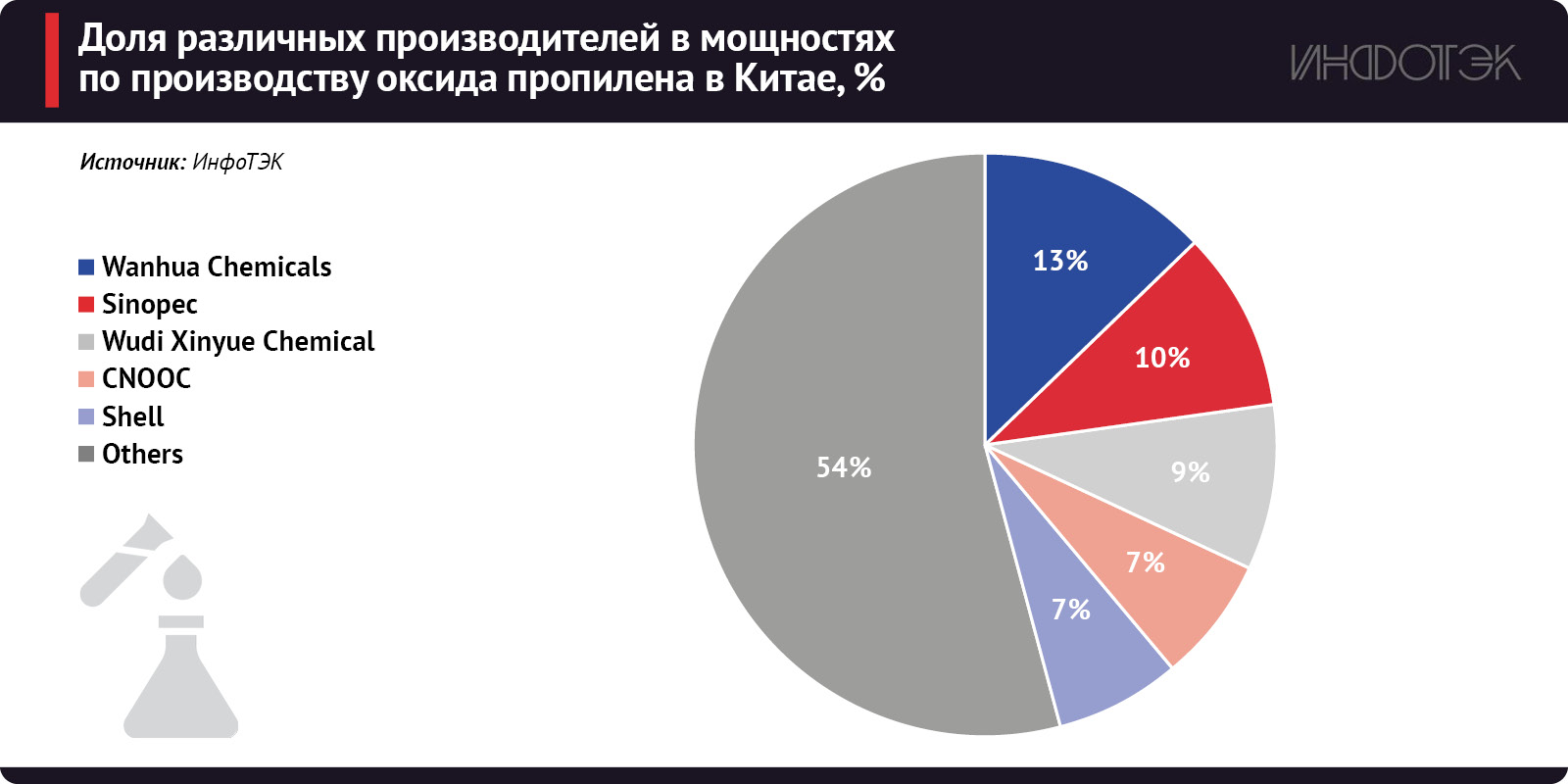 Именно Азия является крупнейшим потребителем оксида пропилена, и поэтому неудивительно, что данный регион также обладает крупнейшими в мире мощностями по его производству (более 40% от мировых). Китай выступает ведущим региональным производителем оксида пропилена, мощности по его выпуску в стране удвоились за последнее десятилетие. Это обусловлено высоким спросом на производные продукты переработки. В пятерку крупнейших производителей оксида пропилена в Китае входят компании Wanhua Chemical, Sinopec, Wudi Xinyue Chemical, CNOOC и Shell (см. рис. 1).