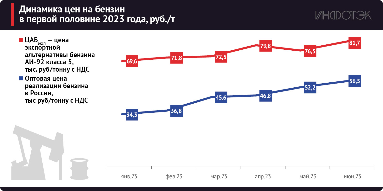 Правительство России также с 1 апреля 2023 года изменило методологию расчета топливного демпфера. По бензину с сентября 2022 года цена экспортной альтернативы в формуле демпфера рассчитывалась с учетом дисконта в цене Urals относительно Brent.