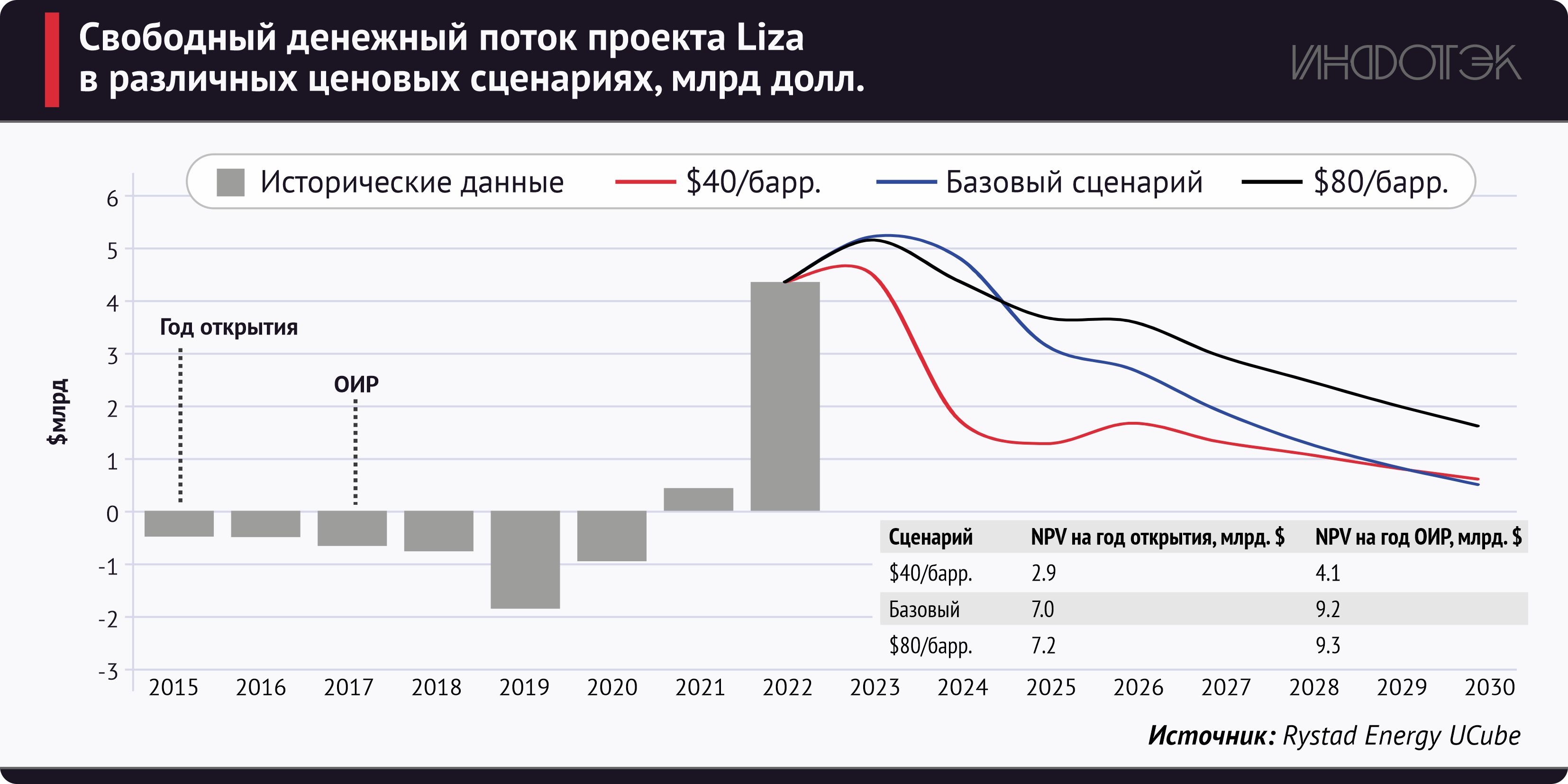 Для наглядности приведем пример месторождения Liza на лицензионном участке Stabroek, который разрабатывает ExxonMobil в морских водах Гайаны. Месторождение было открыто в 2015 году, первая фаза его освоения была санкционирована в 2017 году и стартовала в конце 2019 года. В том же году также была санкционирована вторая фаза разработки, добыча в рамках которой началась в 2022 году. На рис. 1 изображен исторический и прогнозный профиль свободного денежного потока месторождения с 2015 по 2030 годы.