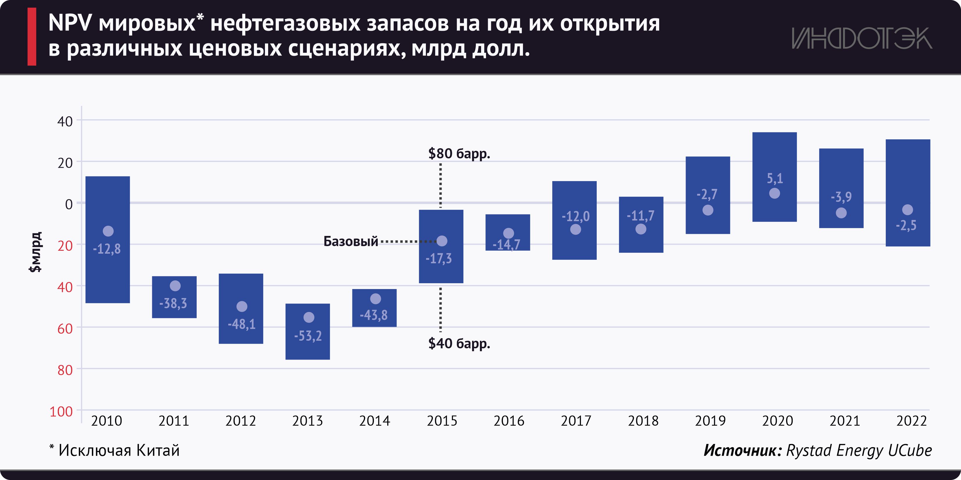 На рис. 2 приведены суммарные значения NPV для всех запасов, открытых с 2010 по 2022 годы (на дату их обнаружения). Нижняя граница столбца соответствует значению NPV в пессимистичном ценовом сценарии, верхняя граница – в оптимистичном. Черным точкам соответствует NPV открытий в базовом ценовом видении Rystad Energy. Например, NPV всех запасов, открытых в 2015 году, составил почти –$40 млрд в низком ценовом сценарии, около нуля – в высоком сценарии, –$17 млрд – в базовом. С 2011 по 2014 годы происходило существенное разрушение стоимости портфелей компаний, проводящих ГРР, поскольку стоимость большинства открытий оказывалась отрицательной, причем во всех ценовых сценариях. Но после ситуация начала выправляться, с 2017 года суммарное NPV открытий было положительным при ценовом прогнозе $80/барр. и стремилось к нулю в базовом сценарии Rystad Energy. Компании закладывали в свои стратегии различные ценовые прогнозы, и многие из них могли похвастаться успешными результатами ГРР.