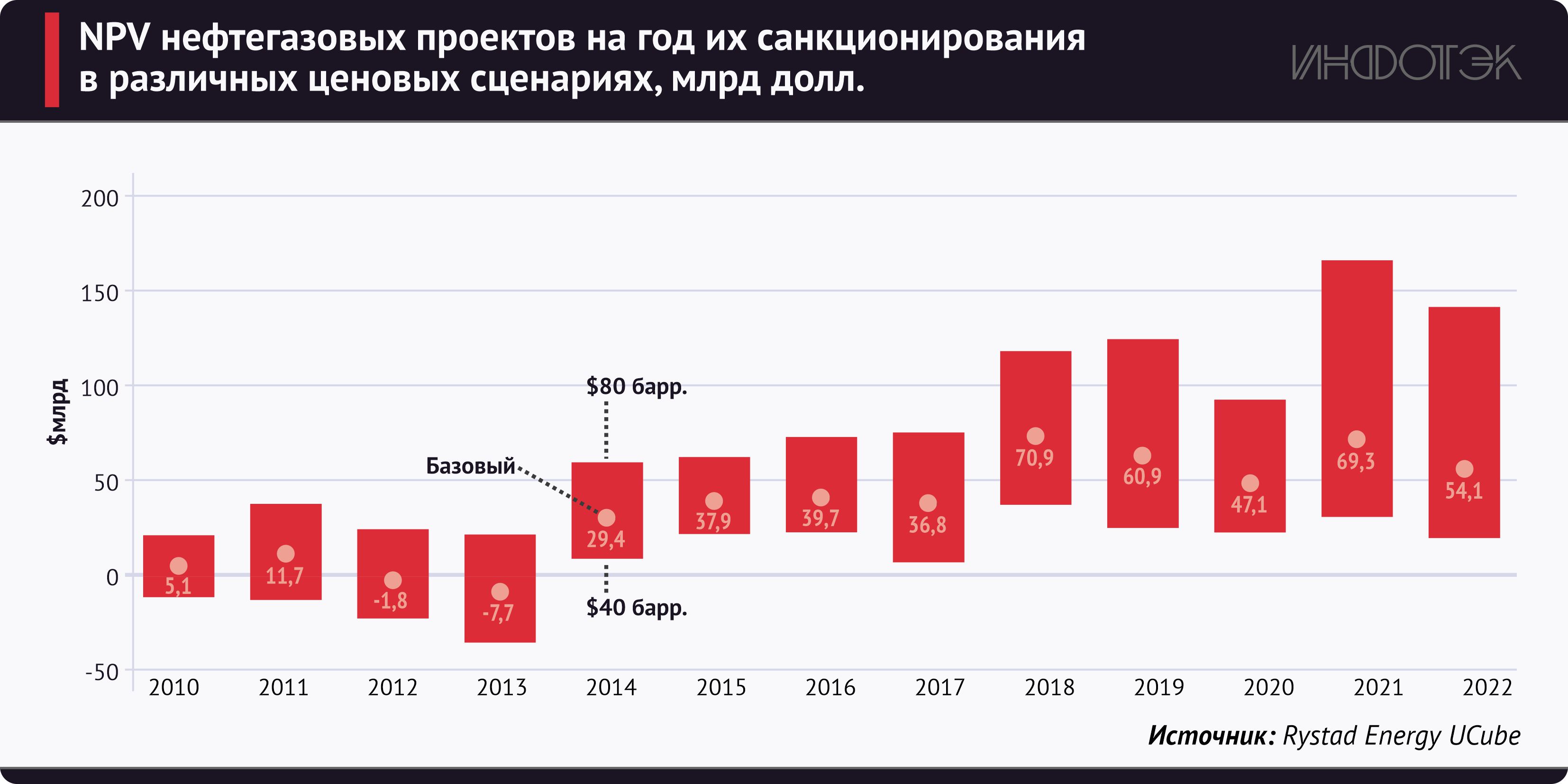 Рис. 3 иллюстрирует динамику NPV проектов (за исключением сланцевых), санкционированных с 2010 по 2022 годы. Например, стоимость проектов, санкционированных в 2014 году, оценивается в $10 млрд в низком ценовом сценарии, в $60 млрд – в высоком и в $30 млрд ­– в базовом. С 2010 по 2013 годы, когда нефтяные котировки превышали $100/барр., высокая стоимость нефтесервисных услуг делала все новые проекты дорогостоящими, снижая их NPV. Но за обвалом цен на нефть в 2014 году последовало и сокращение стоимости нефтесервиса. Добывающие компании со своей стороны также провели мероприятия по оптимизации затрат. С тех пор реализация новых проектов стала обходиться дешевле, толкая показатели NPV вверх. За прошедшие пять лет (2018–2022 годы) суммарное NPV санкционированных проектов превысило $300 млрд в базовом сценарии Rystad Energy. Даже в низком ценовом сценарии они продолжают создавать стоимость.