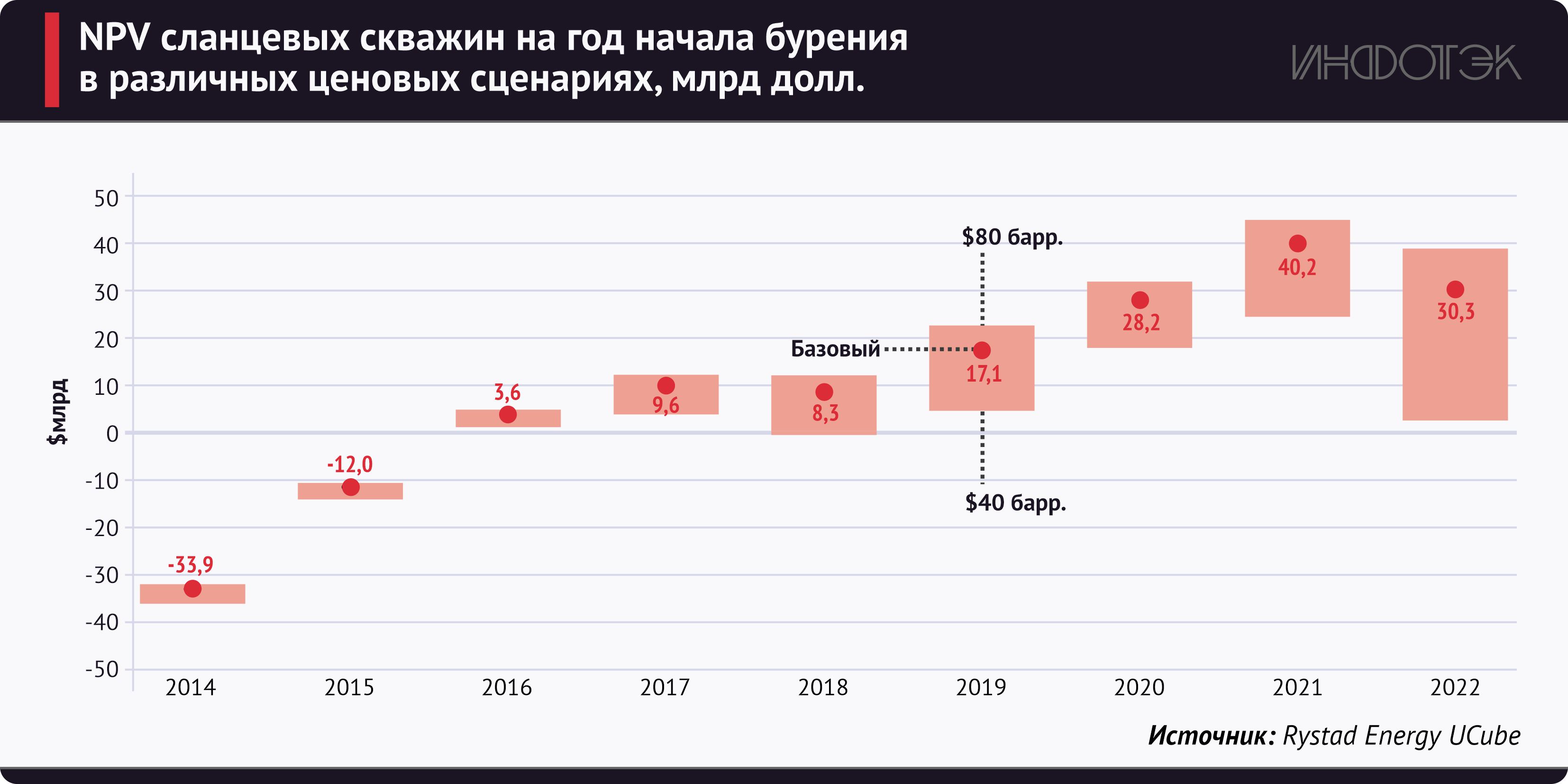 Предыдущий график не включает сланцевые активы, которые анализируются отдельно. На рис. 4 представлена динамика NPV сланцевых скважин на год начала бурения. Таким образом, при расчете NPV учитываются расходы на бурение и заканчивание скважины, а также капитальные затраты на инфраструктурные объекты, на добычу, транспортировку, общие и административные расходы, налоги.