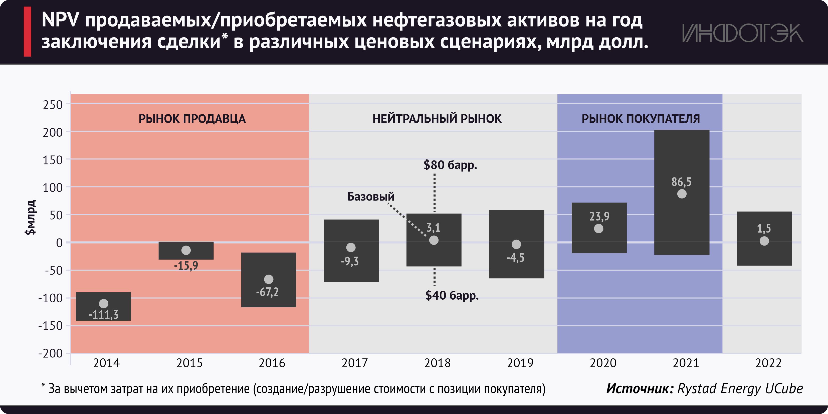 Чтобы оценить динамику создания стоимости в M&A в глобальном масштабе, Rystad Energy рассчитал NPV всех нефтегазовых добывающих активов, с которыми совершались сделки (на дату их закрытия).