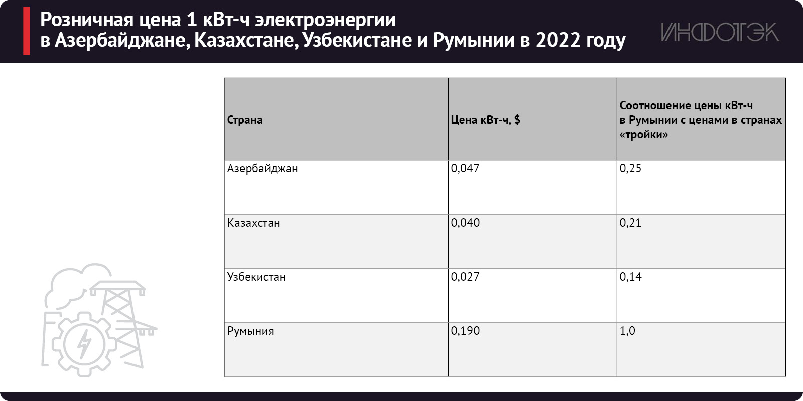 Цены в странах ЕС колеблются в широких пределах. Например, в Дании стоимость электроэнергии самая высокая в Европе, она достигает $0,46 за 1 кВт·ч. Однако мы для сравнения возьмем самые низкие расценки, действующие на румынском рынке (см. табл. 4). Но и этот пример убедительно объясняет стремление экспортировать электроэнергию в ЕС: в Азербайджане 1 кВт·ч дешевле румынского в четыре раза, в Казахстане – в 4,8 раза, в Узбекистане – в семь раз. Поэтому экспорт 1 млрд кВт·ч с Южного Кавказа и ЦА в Румынию принесет доход в $190 млн (минус, конечно, себестоимость производства, расходы на транспортировку, налоги и т. п.).