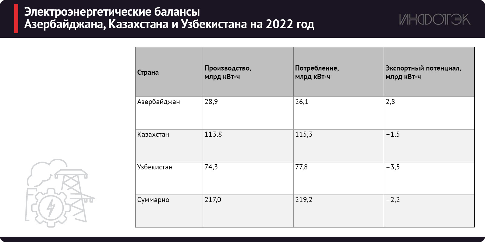 Во-вторых, электроэнергетические балансы стран – участниц проекта показывают, что ничего близкого к названному объему у Баку, Астаны и Ташкента пока нет в наличии (см. табл. 5), то есть экспортировать особо и нечего.
