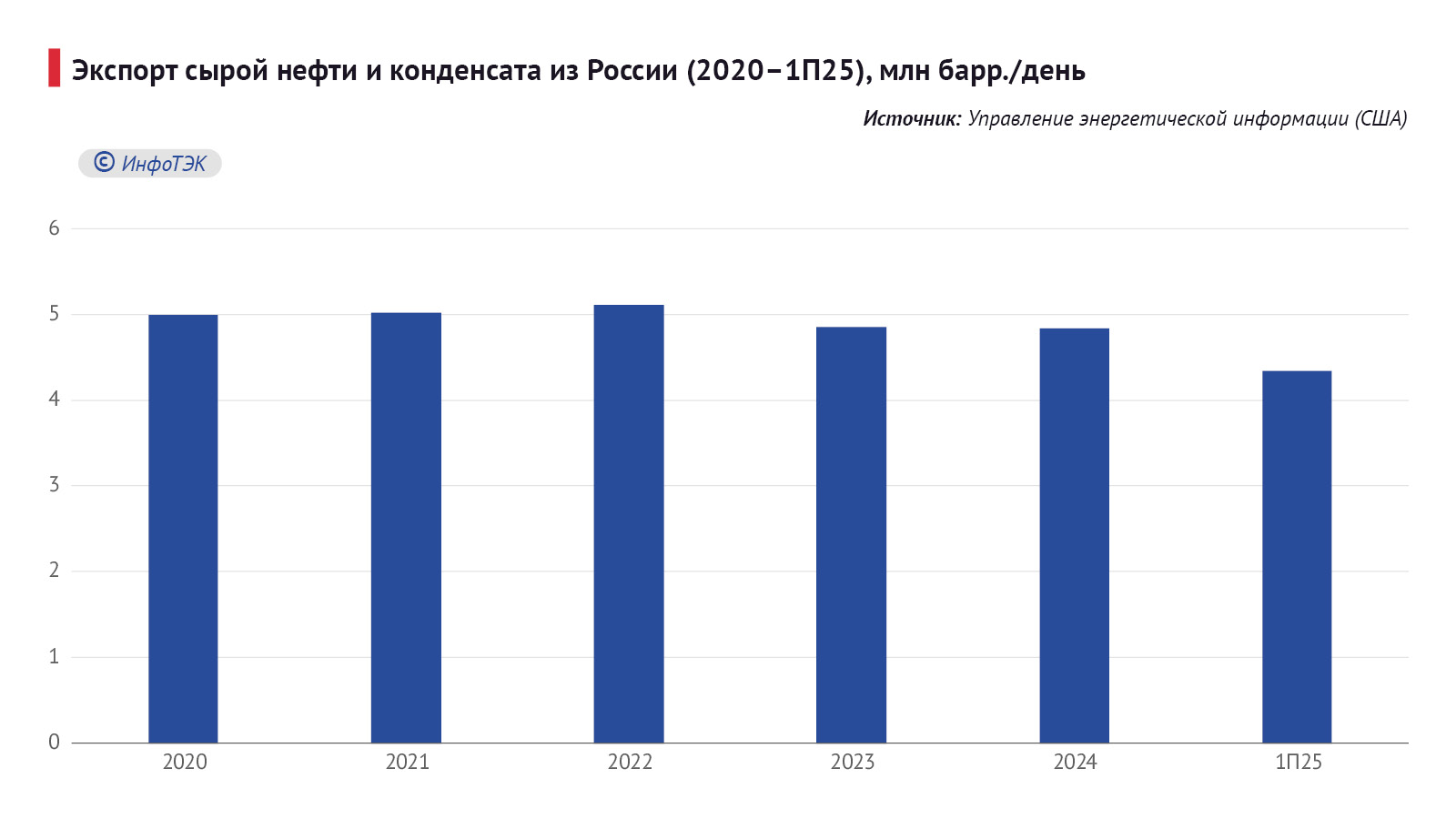 Управление энергетической информации отмечает, что с 2020 по 2024 годы российский экспорт сырой нефти и газового конденсата в среднем составлял 5 млн баррелей в сутки. Но если в первой половине 2024 года этот показатель находился на уровне 4,8 млн баррелей в сутки, то за аналогичный период 2025-го он снизился до 4,3 млн баррелей в сутки. Ссылается УЭИ на данные Global Trade Tracker, Argus и Vortexa.