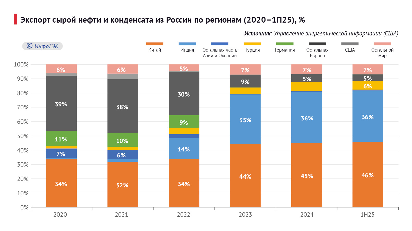 Европейский рынок с успехом заменил рынок Азиатско-Тихоокеанского региона. Притом в 2020-м АТР уже был важным направлением для российской нефти – 41%, а в 2024-м его доля выросла до 81%. Основные покупатели – Китай и Индия.