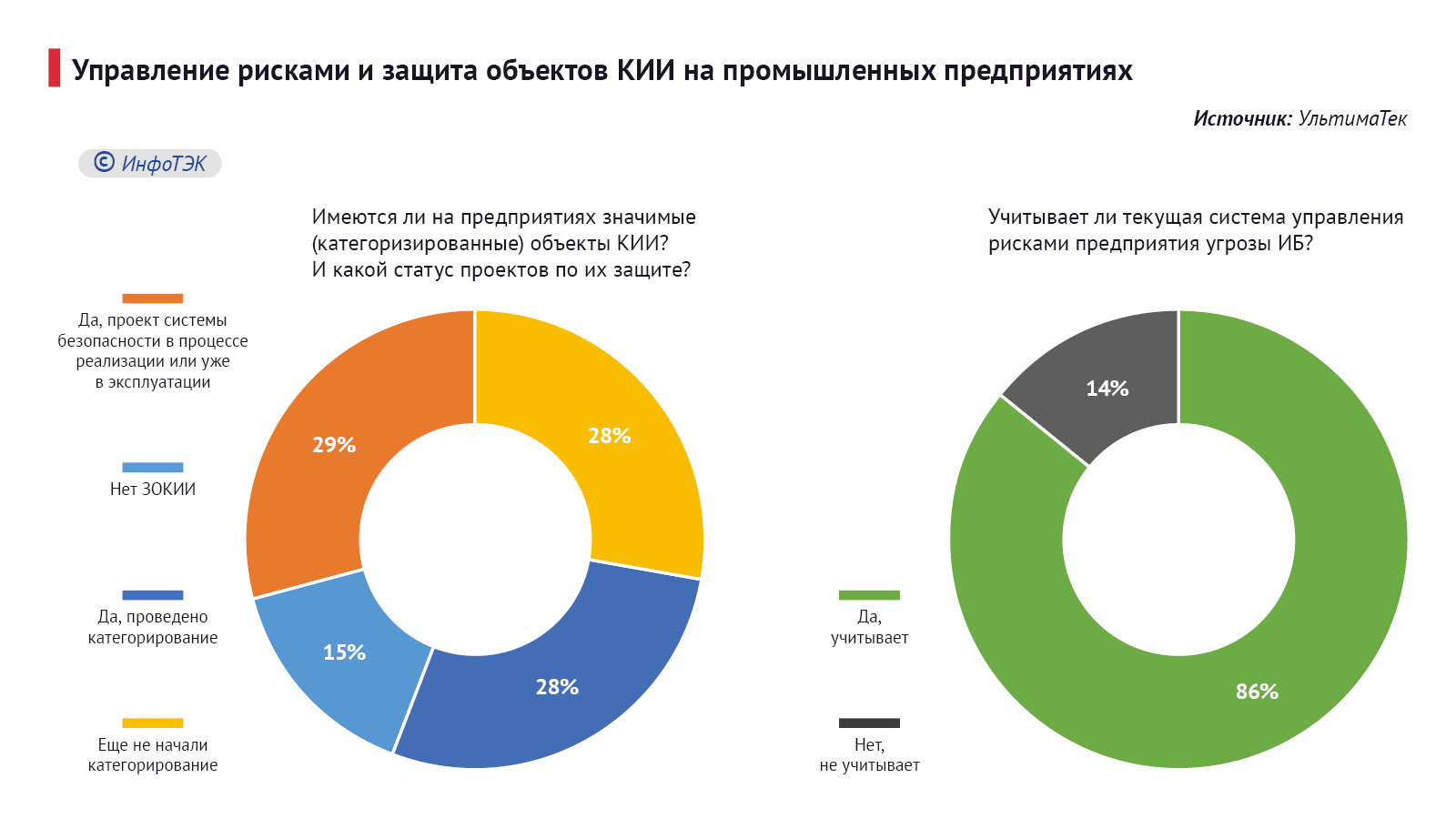 При этом текущий уровень готовности предприятий к киберугрозам остается неоднородным. Согласно данным исследования компаний «УльтимаТэк», Positive Technologies и «Аквариус», лишь 29% компаний ТЭК уже реализуют или эксплуатируют системы защиты для категорированных объектов критической информационной инфраструктуры (КИИ), тогда как 28% только начинают процесс категорирования. Примечательно, что 86% организаций заявляют об учете рисков информационной безопасности в системе управления, однако на фоне роста атак это требует перехода от формального учета к практической реализации защитных мер.