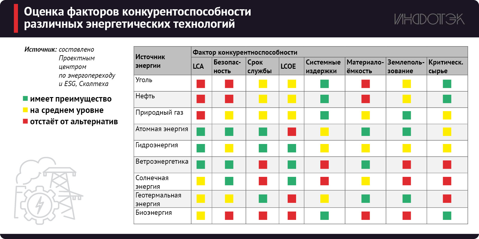 В свете климатических изменений и технологического прогресса возникают новые проблемы для сектора энергетики. Учитывая растущий спрос на энергию и необходимость сокращения выбросов парниковых газов (ПГ), выбор источника энергии требует анализа многих аспектов, например, стоимости, долговечности, безопасности и климатического воздействия. Поэтому необходимо тщательно изучить факторы конкуренции между различными видами топлива и возобновляемыми источниками энергии (ВИЭ)