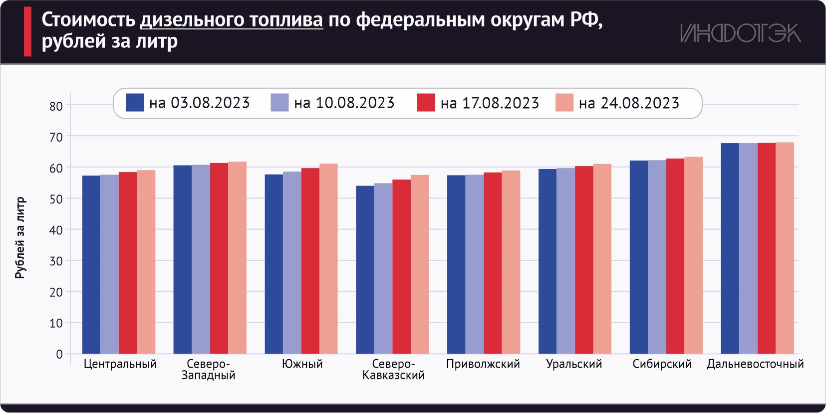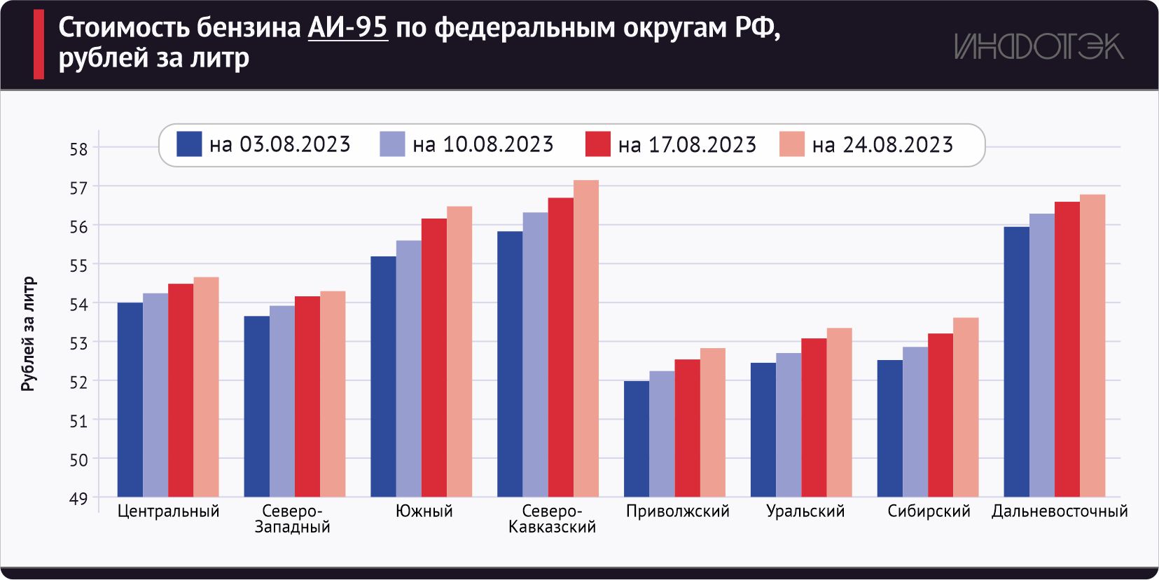 Рост стоимости топлива продолжается во всех федеральных округах (см. рис. 5). В связи с логистическими проблемами цена АИ-92 и АИ-95 в Южном и Северо-Кавказском федеральных округах сравнялась с ценами в Дальневосточном ФО. В целом наблюдается равномерное поступательное движение вверх всех цен.