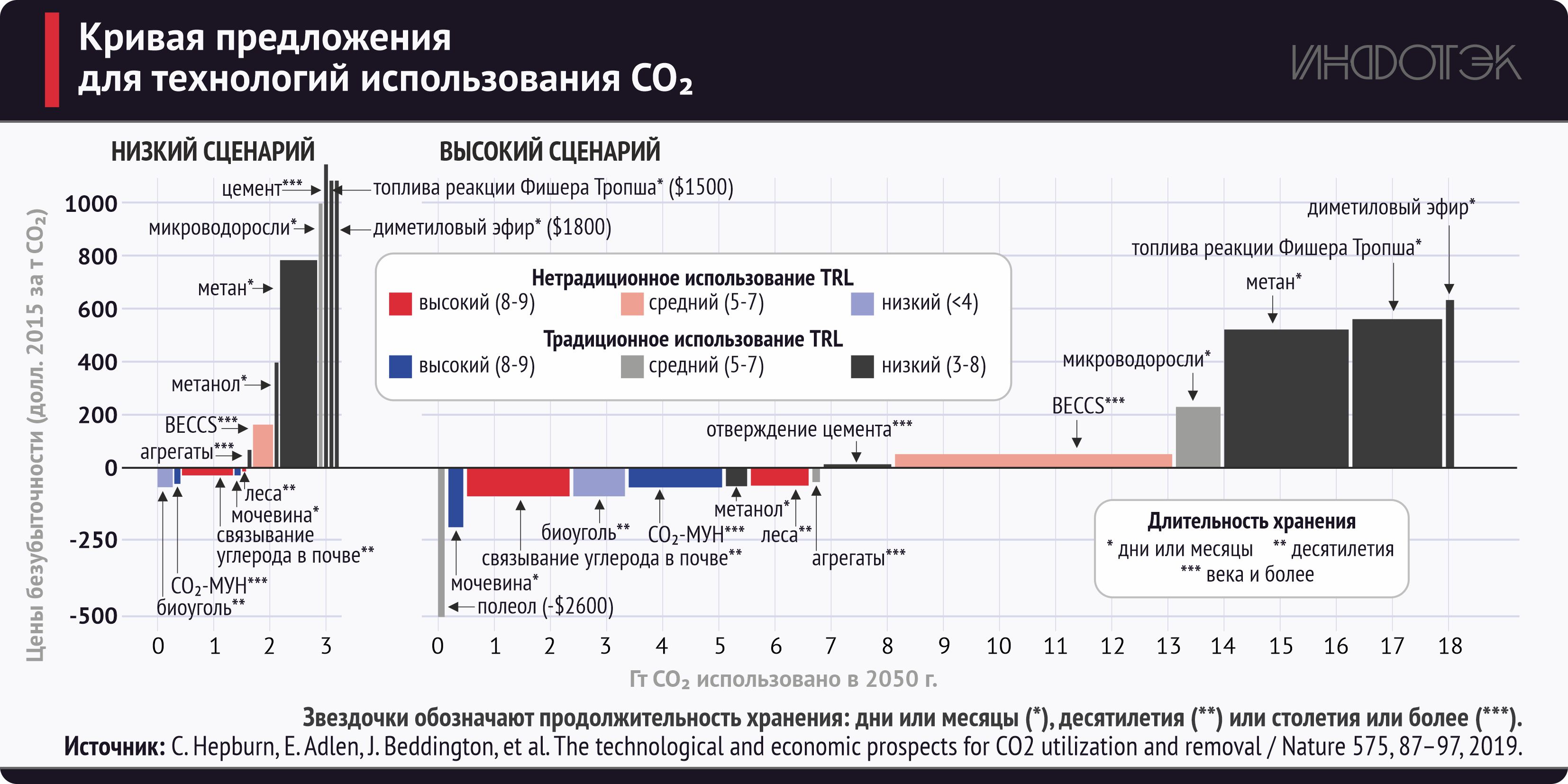 Такое расхождение обусловлено тем, что большинство технологий преобразования CO2 все еще находятся на ранней стадии развития, а их технические характеристики и экономическая эффективность недостаточно изучены. Поэтому оценка их потенциала требует принятия допущений относительно будущих технических параметров, затрат, времени достижения зрелости, относительной конкурентоспособности, способности промышленности и потребителей адаптироваться к новой технологии, возможности преодолеть присущую отрасли инертность и т. д. Кроме того, все эти факторы весьма специфичны для различных областей применения и секторов.