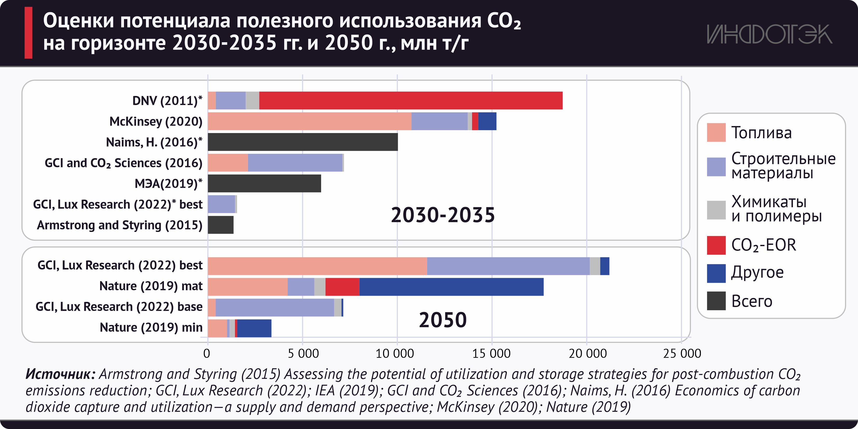 Будущий рынок продуктов, получаемых из CO2, сложно оценить ввиду ранней стадии развития технологий и самой индустрии. Оценки потенциала полезного использования CO2 колеблются в широких пределах: от 1,37 Гт в год на период 2030–2035 годов до более 20 Гт в 2050 году (см. рис. 2).