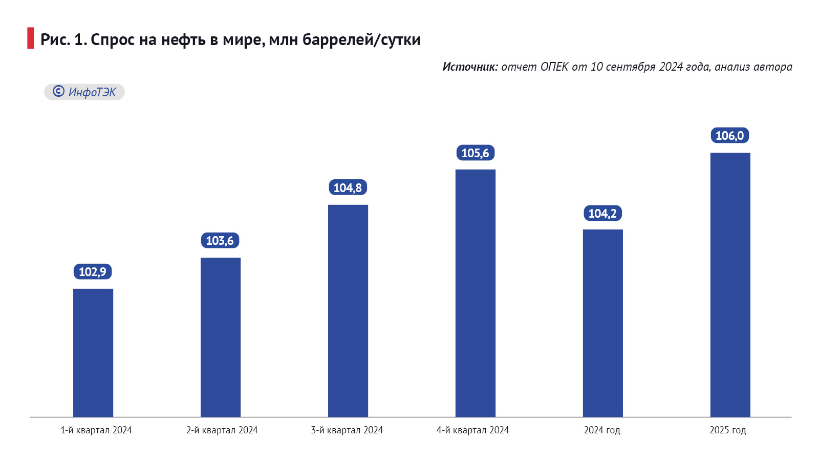 Таким образом, по данным ОПЕК, спрос на нефть с начала 2024 года стабильно превышает предложение и в третьем квартале может достичь отметки 104,8 млн баррелей в сутки, что выше предложения на 2,4 млн баррелей в сутки.
