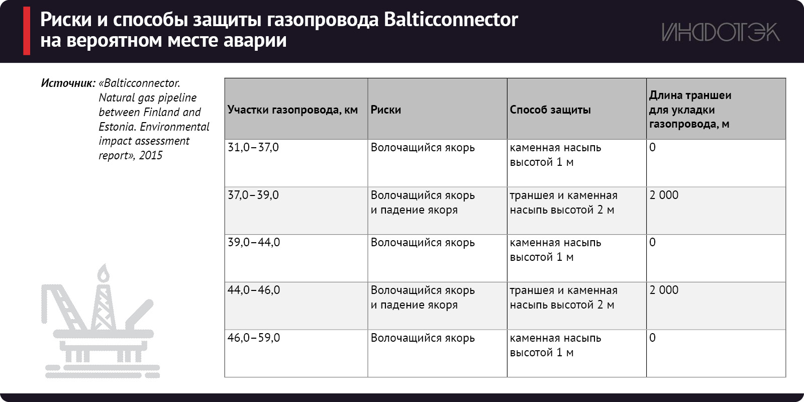 Достаточно странно, что настолько серьезный объект, как магистральный газопровод, был с легкостью разрушен якорем судна. Балтийское море является важной мировой и региональной транспортной артерией с интенсивным круглогодичным судоходством. По умолчанию сценарий столкновения якоря судна с газопроводом должен был быть учтен при оценке рисков. И действительно, анализ воздействия на окружающую среду, выполненный в 2015 году, содержал описание данного риска. Поэтому было констатировано, что для предотвращения подобного ЧП газопровод должен был быть углублен в грунт и/или засыпан камнями (высота насыпи должна была составить от 1 до 2 метров в зависимости от места прокладки, см. табл. 1).