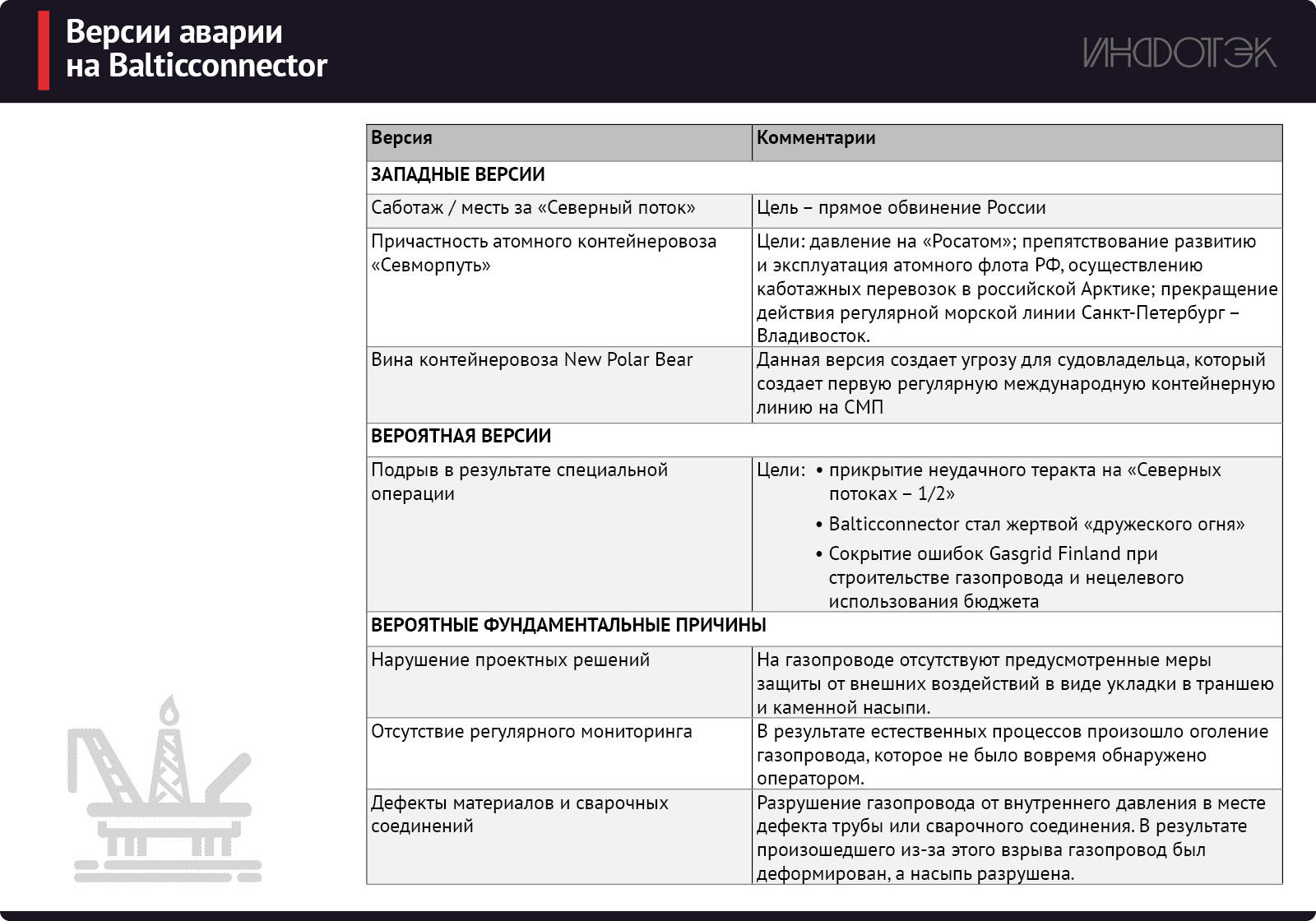 В России соответствующее расследование уже проводится. Его инициатором стал научно-образовательный центр мирового уровня (НОЦ) «Север: территория устойчивого развития» с участием Экономической лаборатории АлександрА КлиментьевА и телеграм-канал «Молекулы Добра». Его цель – на объективной основе выявить причины аварии, а также дать дополнительную информацию проектировщикам, строителям и операторам подводных газопроводов с целью создания надежной и безопасной инфраструктуры транспортировки природного газа во всех регионах мира. На данный момент исследование близится к завершению, краткие характеристики рассмотренных версий представлены в табл. 2.