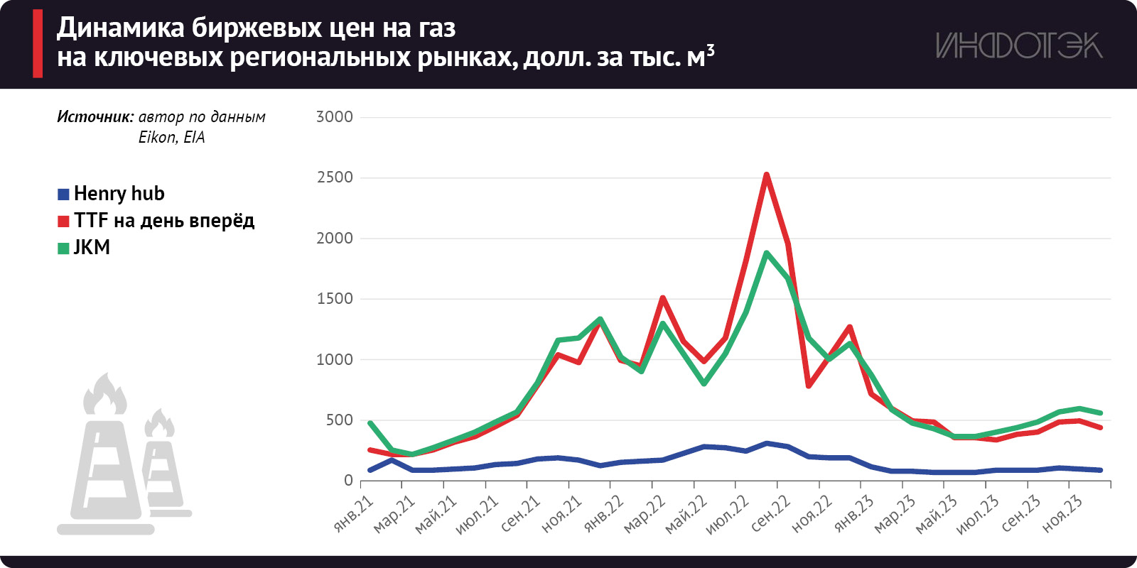 Но, несмотря на схожую динамику, уровень цен на рынках существенно отличается. Так, в США цены в 2023 г. опустились к нижней границе многолетних значений под влиянием как падения импортных цен на СПГ, так и исключительно благоприятного баланса на внутреннем рынке: рост добычи, по данным EIA, почти в четыре раза превышает прирост внутреннего потребления, что благоприятно влияет и на рекордную динамику запасов в ПХГ. В Европе среднегодовые номинальные цены, напротив, остаются почти в 2,5 раза выше значений 2015-2020 гг., хотя и на 6% ниже уровня 2021 г. (многие уже стали забывать, но стремительный рост биржевых цен на газ начался еще в середине 2021 г. и в 4-м квартале 2021 г. средняя спотовая цена на TTF превышала $1100 за тыс. куб. м).