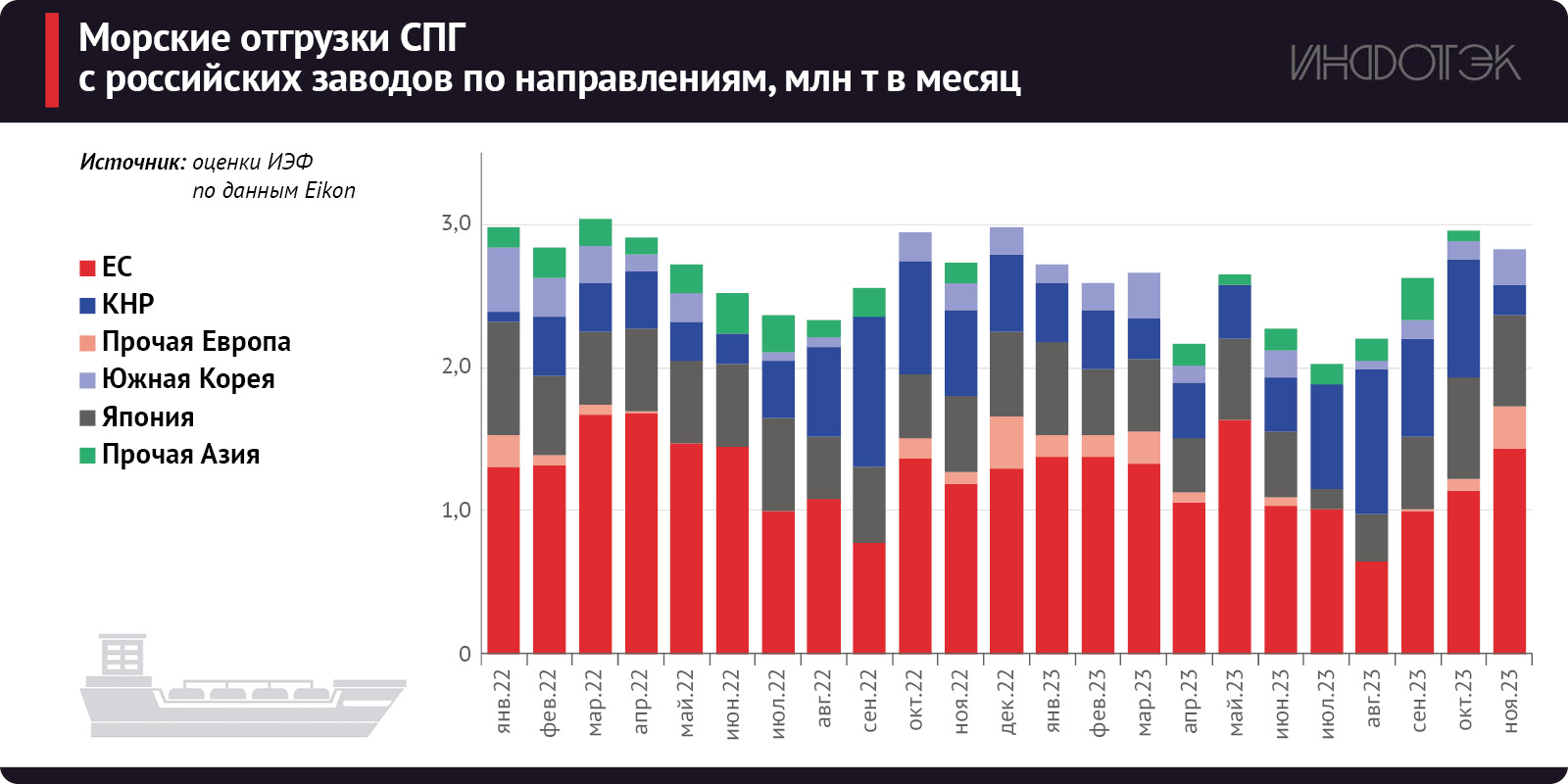 Мировым лидером по темпам роста спроса на СПГ в 2023 г. стали страны Юго-Восточной Азии (+20% за январь-ноябрь). Отгрузки в Таиланд выросли на 32%, в Сингапур – на 25%, в Индонезию – на 13%. Снижение (-7%) наблюдается только в Малайзии. В итоге баланс СПГ в Юго-Восточной Азии на фоне стагнации производства становится все менее профицитным.