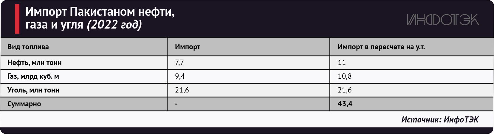 Доля Пакистана в ТАПИ – 13,8 млрд куб. м газа в год, а по ИПИ Исламабад мог бы получать 21,5 млрд куб. м в год. Суммарные 35,3 млрд куб. м (40,6 млн тонн у. т.) могли бы добавить 68,4% к собственному производству (в 2022 году) ископаемого топлива. Но оба проекта не задались, хотя и по разным причинам.