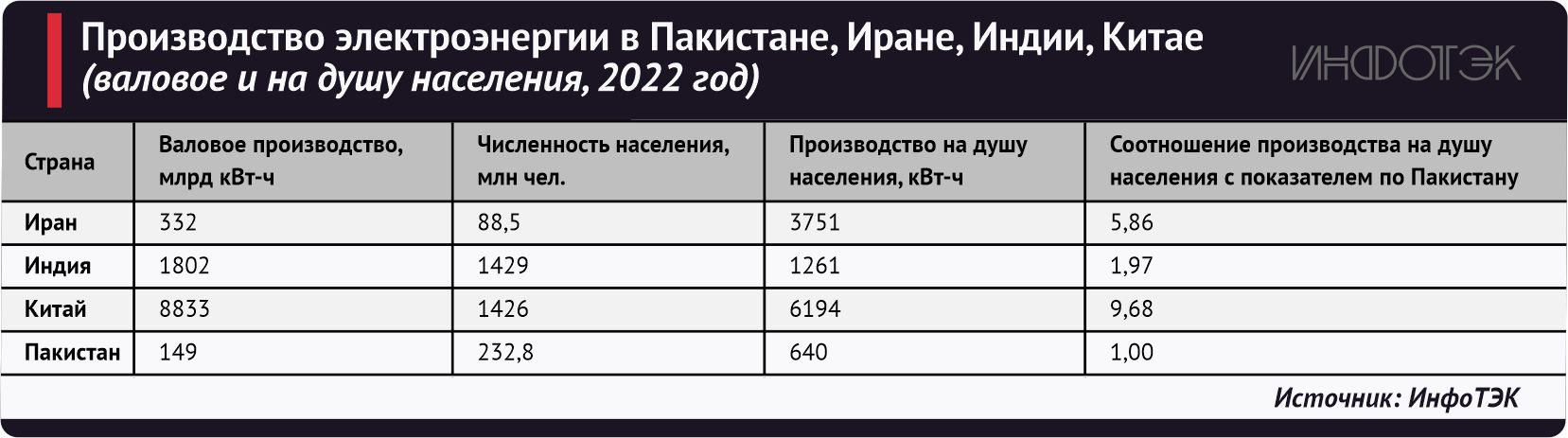 Ограниченность ресурсов ископаемого топлива закономерно отразилась на выработке электроэнергии: в 2022 году объемы генерации в Пакистане были меньше, (см. табл. 3), чем в соседних Иране, Индии и Китае (Афганистан, разоренный многолетними войнами, вряд ли может служить объектом для сравнения).