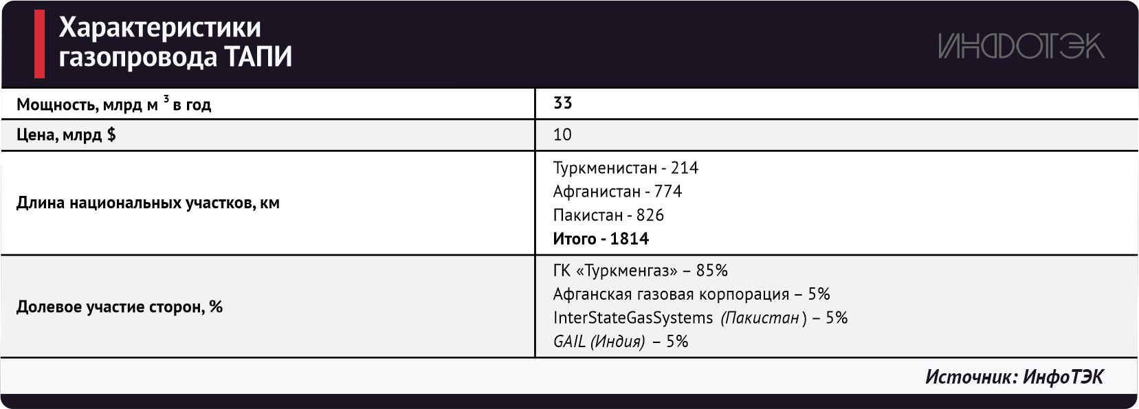 У ТАПИ, казалось бы, были все шансы на успех. Газовые ресурсы Туркменистана оцениваются в 19,5 трлн куб. м, а официальные оценки властей страны существенно выше – 27,5 трлн куб. м (в них включены и запасы базового для газопровода месторождения Галкыныш – 21,2 трлн куб. м газа). В связи с этим Ашхабад крайне заинтересован в создании нового экспортного маршрута, и поэтому уже в 2015 году силами «Туркменгаза» началось строительство туркменского участка трубопровода. В 2018 году ТАПИ достиг туркменско-афганской границы, Ашхабад пообещал Кабулу профинансировать работы на афганском участке, и 23 февраля 2018 года в районе Серхетабата состоялась торжественная церемония начала его сооружения. Но дальше торжеств дело не пошло, практические работы так и не начались, а в августе 2021 года власть в Афганистане взяло движение «Талибан» (запрещено на территории РФ). Правда, в октябре текущего года талибы заявили, что теперь в стране обеспечена безопасность, и поэтому Кабул принял решение о приобретении земли для прокладки магистрали ТАПИ. Но неизвестно, какие компании готовы рисковать своими сотрудниками и техникой ради осуществления данного проекта.