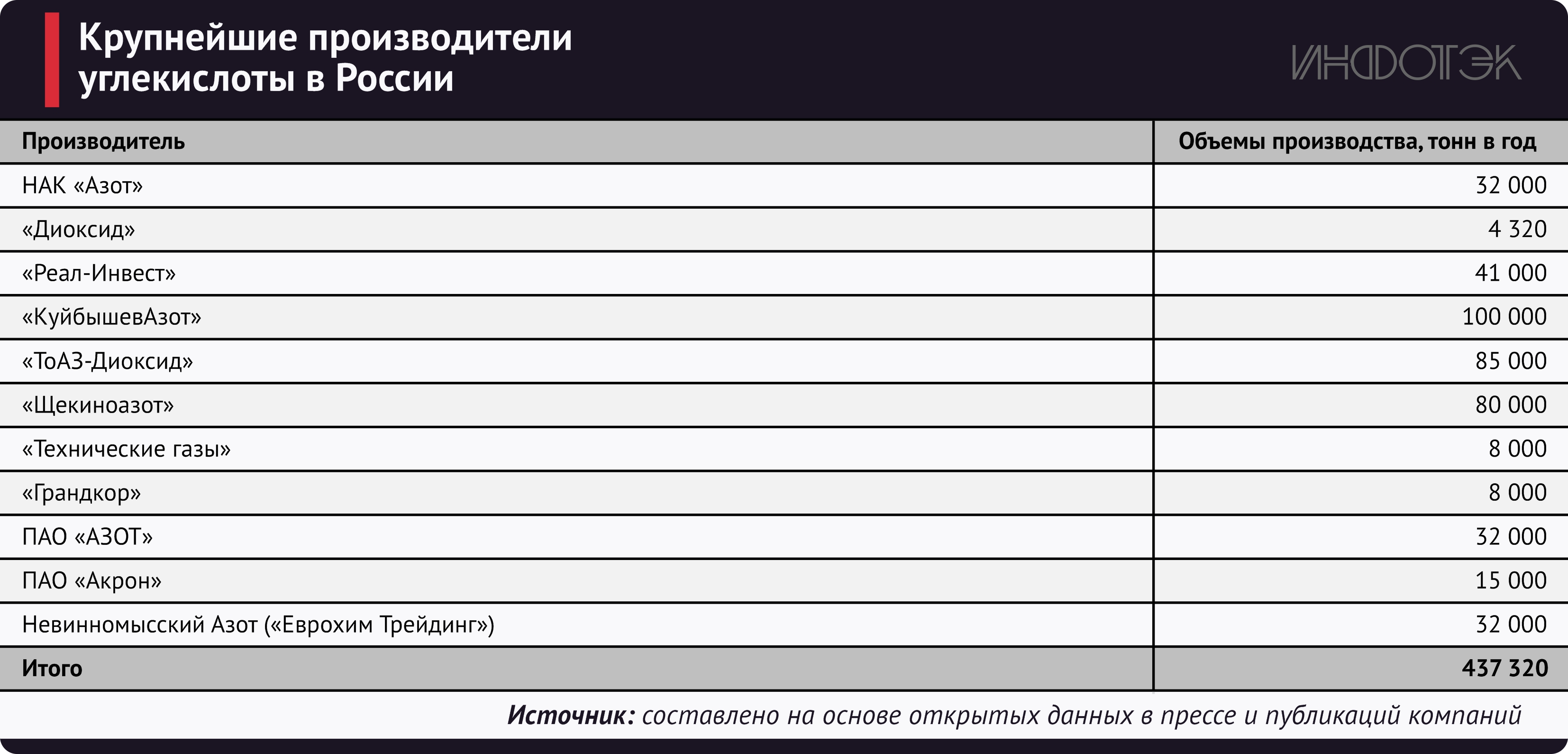 Двуокись углерода улавливается не только для того, чтобы соответствовать современным тенденциям, но и для решения вполне конкретных производственных задач: от выпуска удобрений до наполнения огнетушителей. Рынок углекислоты в России – сфера, по которой имеется мало информации в открытом доступе. Минпромторг оценивает спрос на углекислоту в стране на уровне 270 тыс. т в год. А по данным исследования BusinesStat 2022 года, в 2017–2021 годах продажи углекислоты в РФ выросли в 1,8 раза: с 465 до 852 тыс. т. При этом мощности по производству углекислоты, по нашим оценкам, могут достигать 440 тыс. т в год. Выпуском углекислоты в России занимаются 11 основных предприятий, главным образом к ним относятся производители аммиака и минеральных удобрений (см. табл. 1).