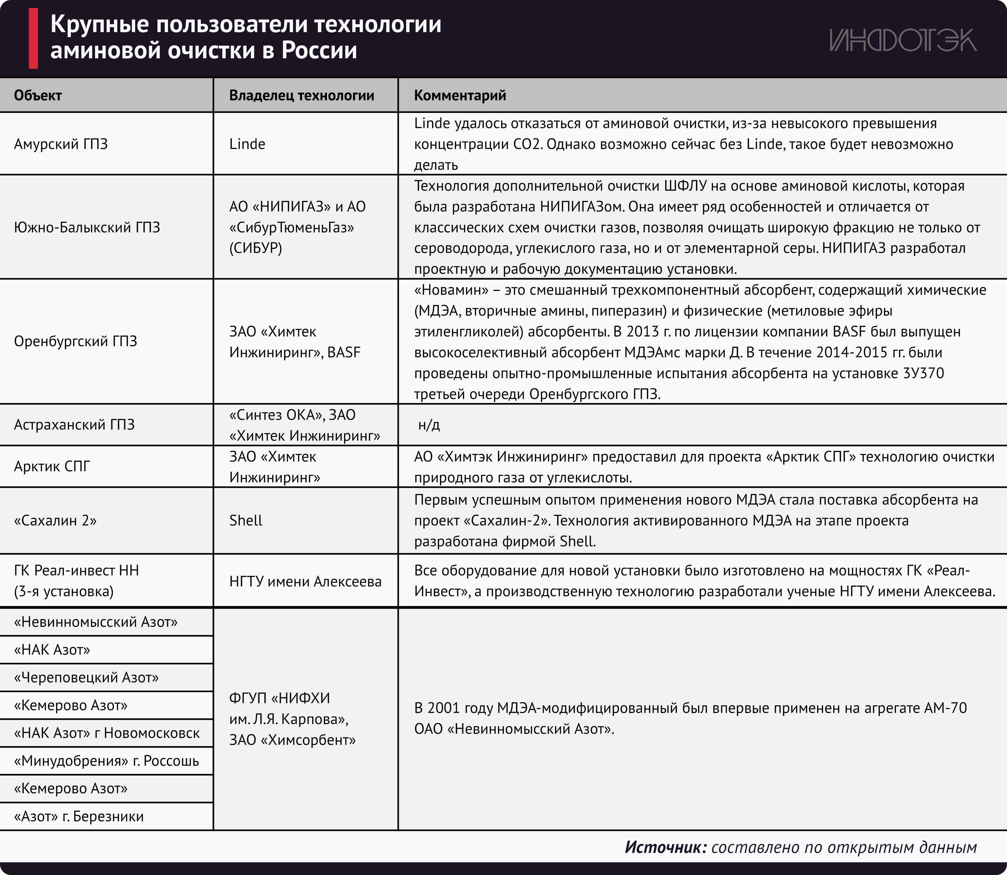 В таблице 1 указаны производители товарной углекислоты, однако спрос на саму технологию улавливания СО2 намного выше, поскольку она востребована в нефтегазовой промышленности для очистки от углекислоты и сероводорода. В таблице 2 перечислены крупные отечественные пользователи и владельцы технологии аминовой очистки в нефтегазовой отрасли и среди производителей удобрений. Анализ показал, что большая часть ключевых компонентов процесса аминовой очистки – моноэтаноламинов (МЭА) и метилдиэтаноламинов (МДЭА) – на сегодняшний день может производиться внутри страны.