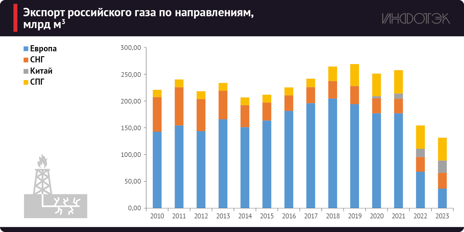 В структуре добычи учитывается как непосредственно природный газ (преимущественно метан), так и попутный нефтяной газ (ПНГ). Добыча природного газа уменьшилась в 2023 году на 41,9 млрд куб. м (-7,3% к 2022 году) – до 531,7 млрд куб. м. В свою очередь, добыча ПНГ увеличилась на 6 млрд куб. м (+6,1% к 2022 году) – до 105 млрд куб. м.