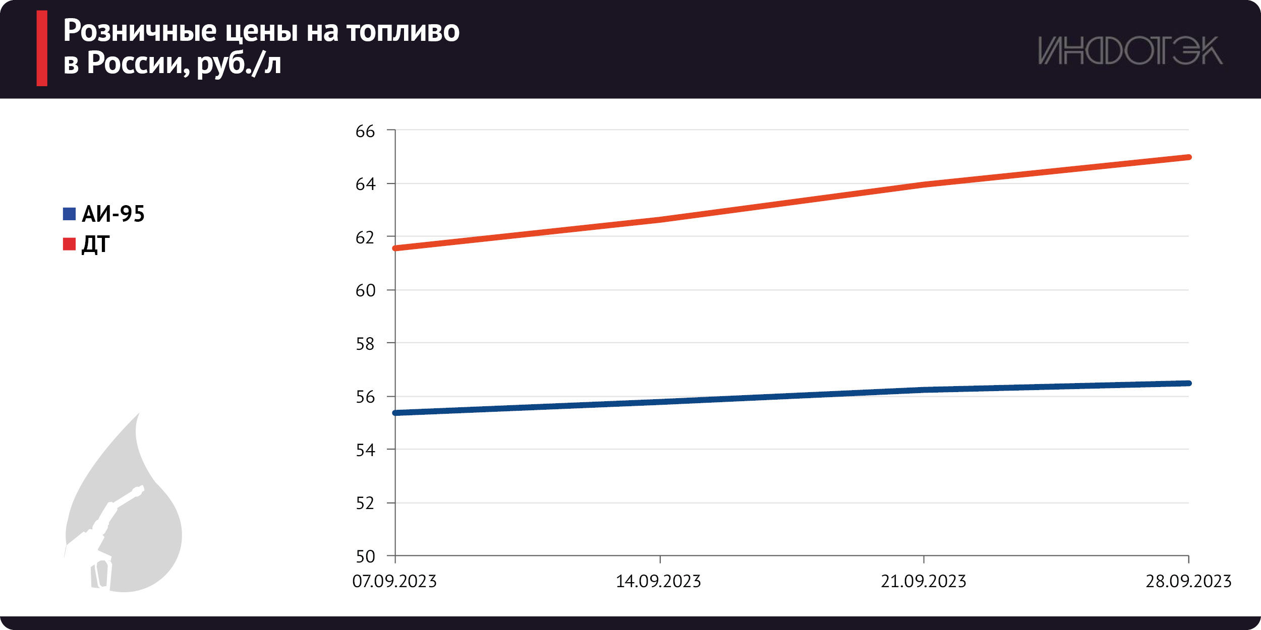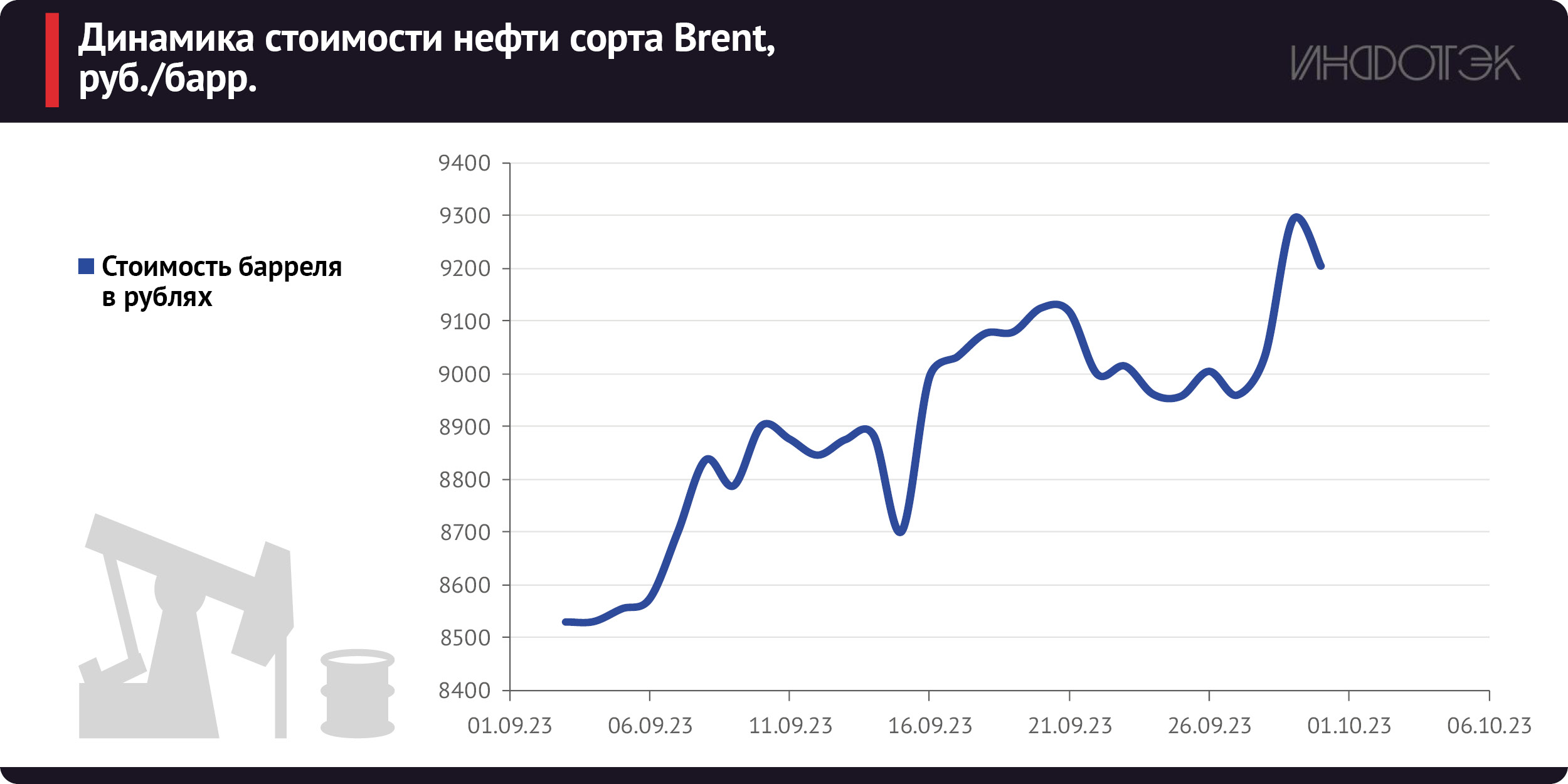 Стоимость нефти, выраженная в рублях, за счет снижения курса национальной валюты вышла на новую величину – более 9 тыс. рублей за баррель. Преодолев данный уровень еще в начале месяца, она затем немного откатилась назад, но к концу сентября достигла 9 284 рублей за баррель (см. рис. 1). Для наполнения бюджета это положительный фактор, однако для внутренних цен на топливо – строго отрицательный. Именно повышение стоимости нефти в рублях, сопряженное с изменениями параметров демпфера, привело к топливному кризису на внутреннем рынке и стало причиной экстренного запрета экспорта товарных нефтепродуктов, введенного с 21 сентября.