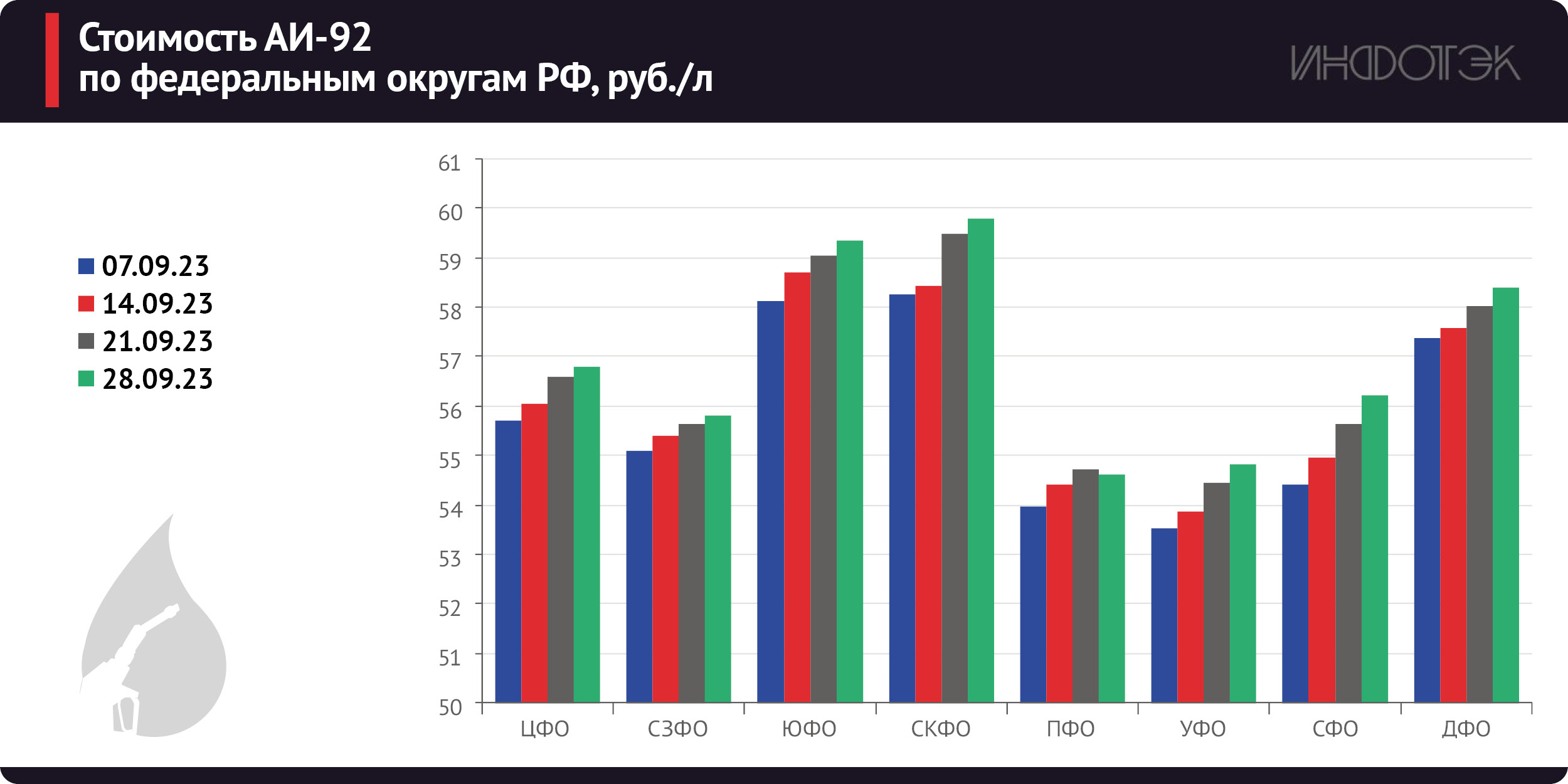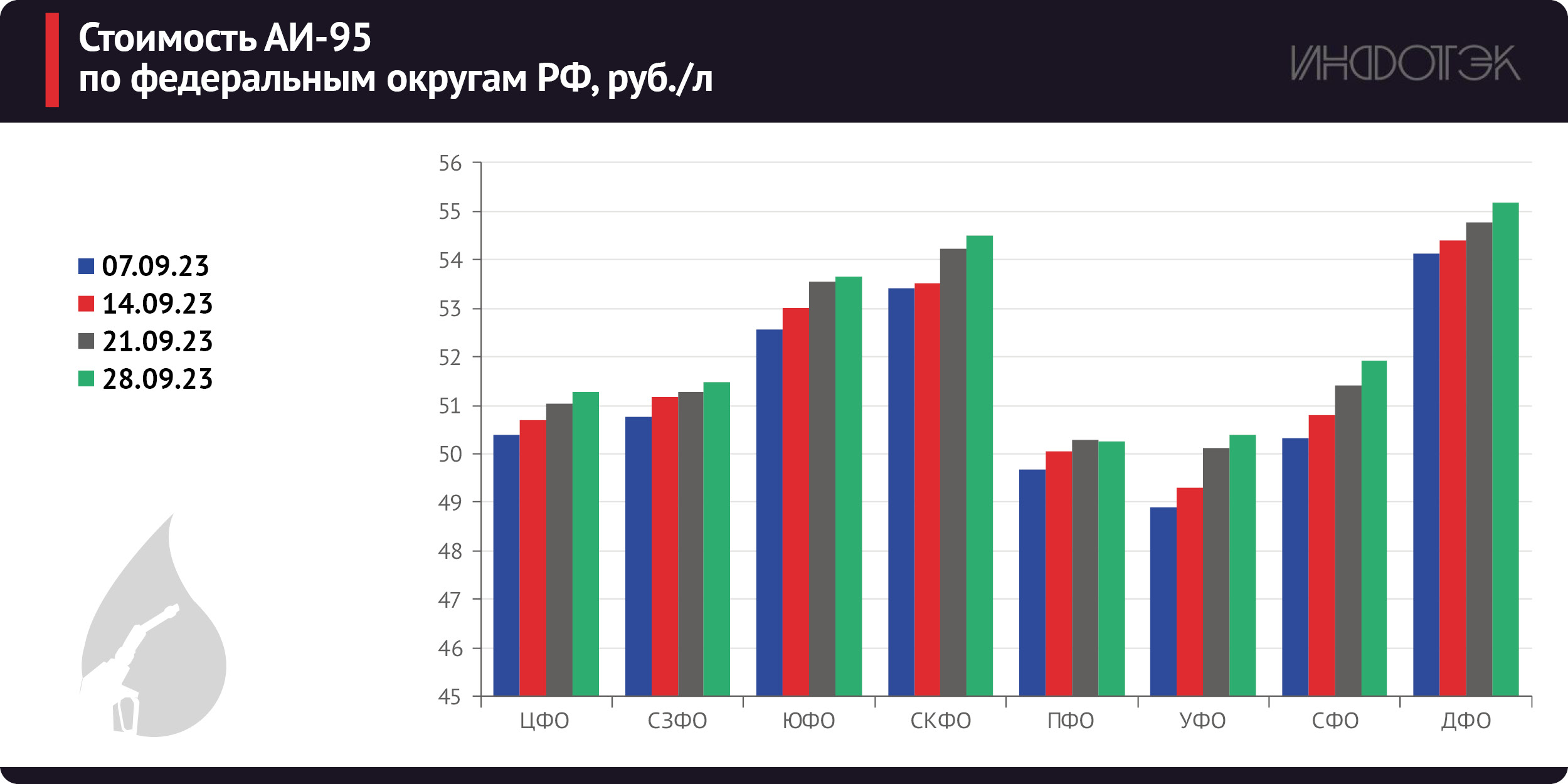 Сентябрь показал рост розничных цен во всей красе – по всем регионам (см. рис. 3). Повышение оптовых цен, проблемы с логистикой, отсутствие топлива в мелкооптовом сегменте – все эти факторы привели к подорожанию бензина на АЗС по всей России. Одновременно наблюдалось временное отсутствие топлива на некоторых заправках. И если ВИНКи в целом старались держать стоимость топлива в рамках инфляции, то независимые сети, вынужденные приобретать топливо на бирже, зачастую продавали его дороже (до 10 рублей за литр), чем ВИНКи. Указанное обстоятельство вынуждало клиентов переходить на АЗС крупных компаний, что увеличивало потребление на данных заправках – часто бензовозы просто не успевали подвозить топливо.