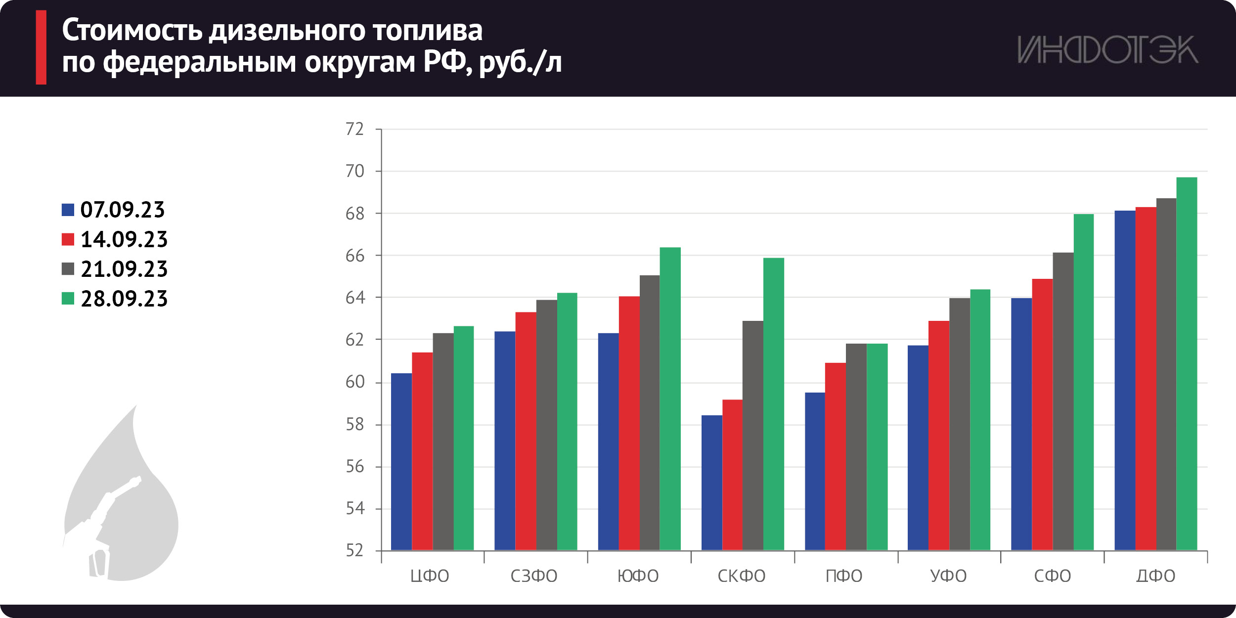 Приволжский и Уральский федеральные округа остаются территориями с минимальными ценами на топливо. Насыщенность НПЗ и отдаленность от экспортных рынков играют на российского потребителя. Основным регионом, требующим внимания, является Дальневосточный округ, где стоимость дизельного топлива движется к отметке 70 рублей за литр (см. рис. 5).