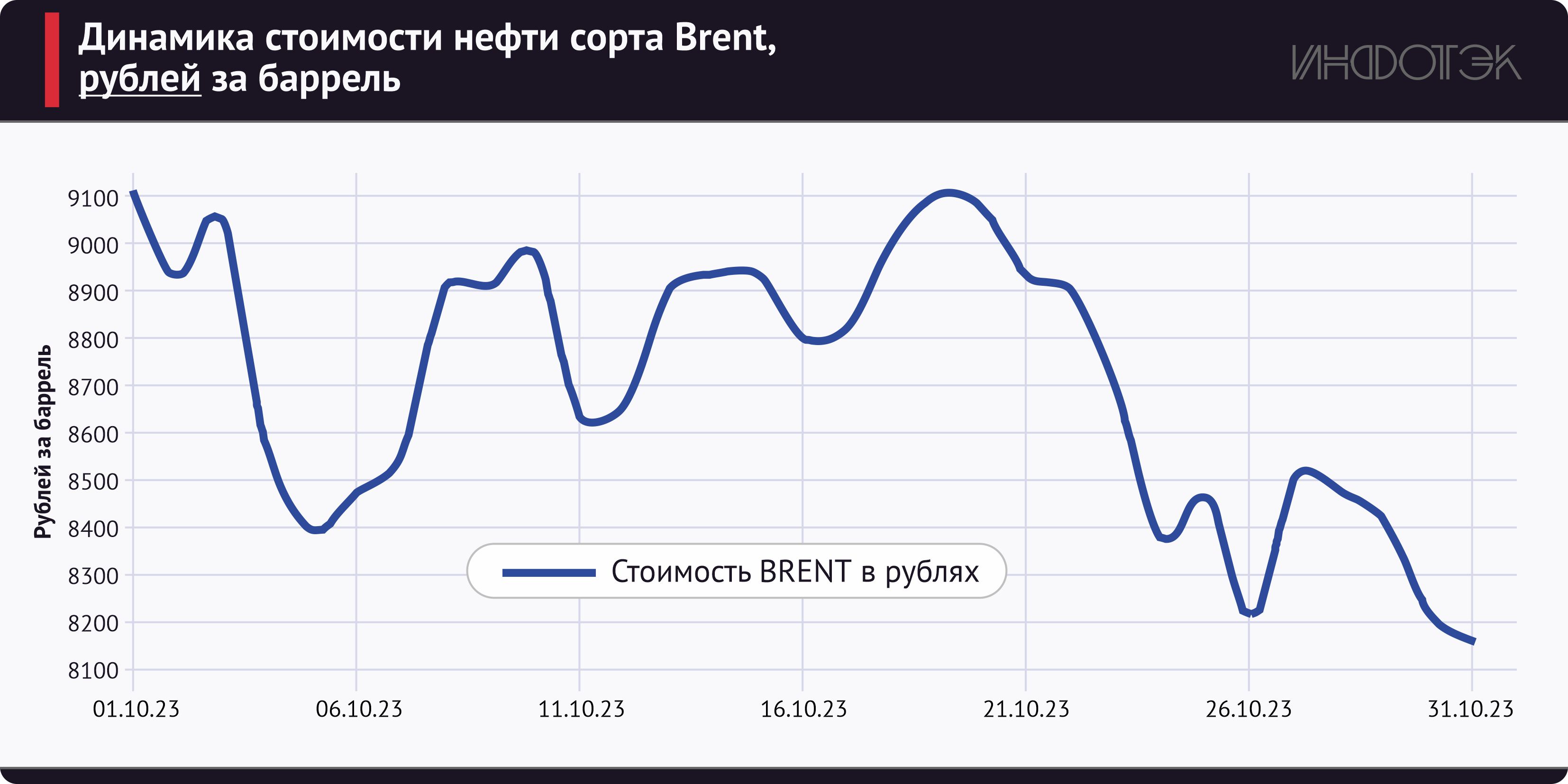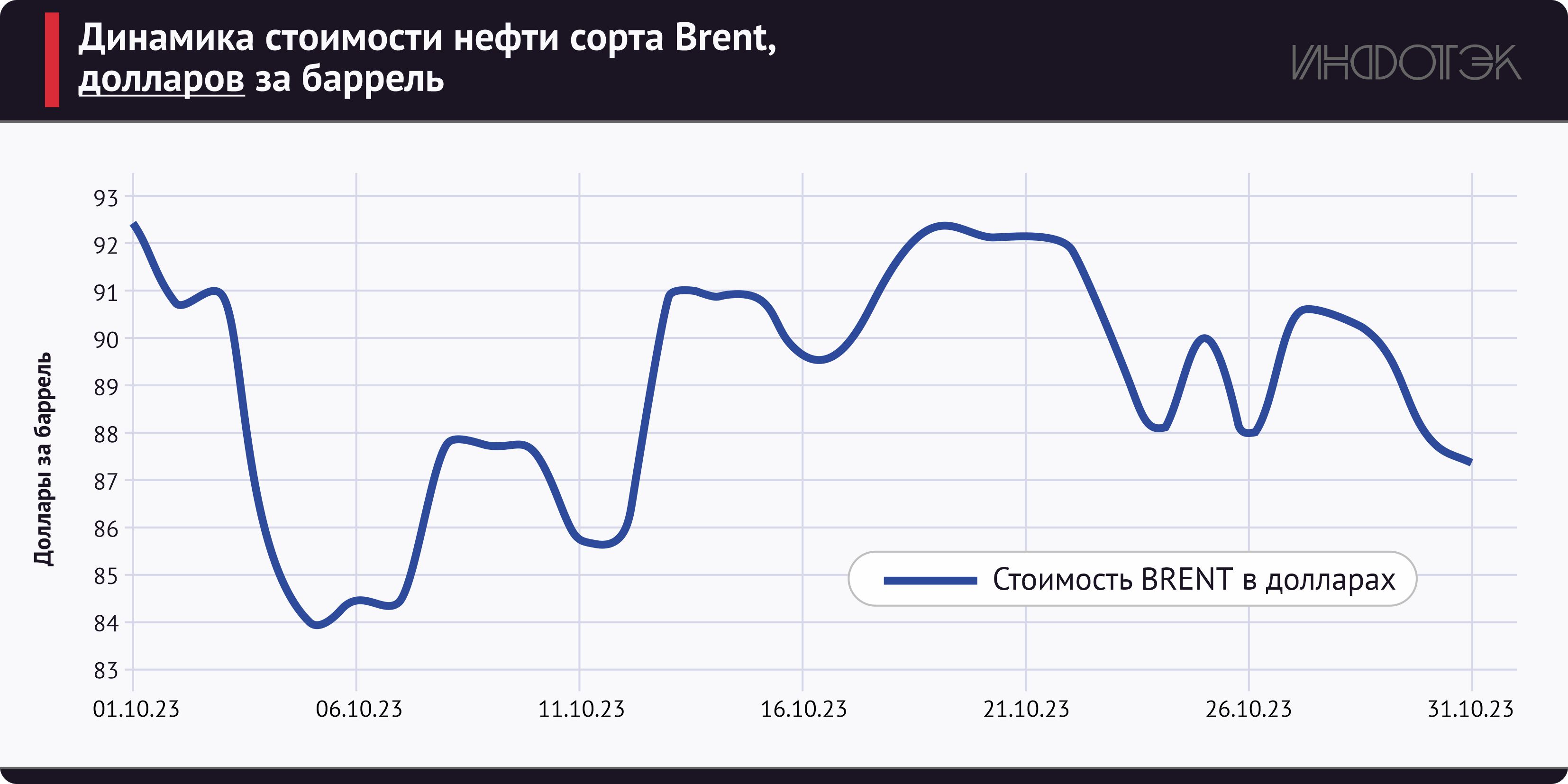 Октябрь 2023 года стал периодом роста нефтяных цен. Повышение котировок было в значительной мере обусловлено ожиданиями разрастания конфликта на Ближнем Востоке и втягивания в него исламских государств. Кроме того, нефтяные цены поддерживаются усилиями ведущих стран-производителей – Саудовской Аравии и России, которые продолжают добровольное сокращение добычи. В свою очередь, крупнейшие потребители – западные государства – используют информационные методы давления на рынок. Так, в октябре в западных СМИ периодически появлялись публикации о якобы несоблюдении той или иной стороной соглашений об ограничении добычи, теневых поставках на рынок вместо сокращения добычи и т. п. Однако баланс спроса и предложения соблюдается, в результате прослеживается тенденция к росту стоимости нефти.