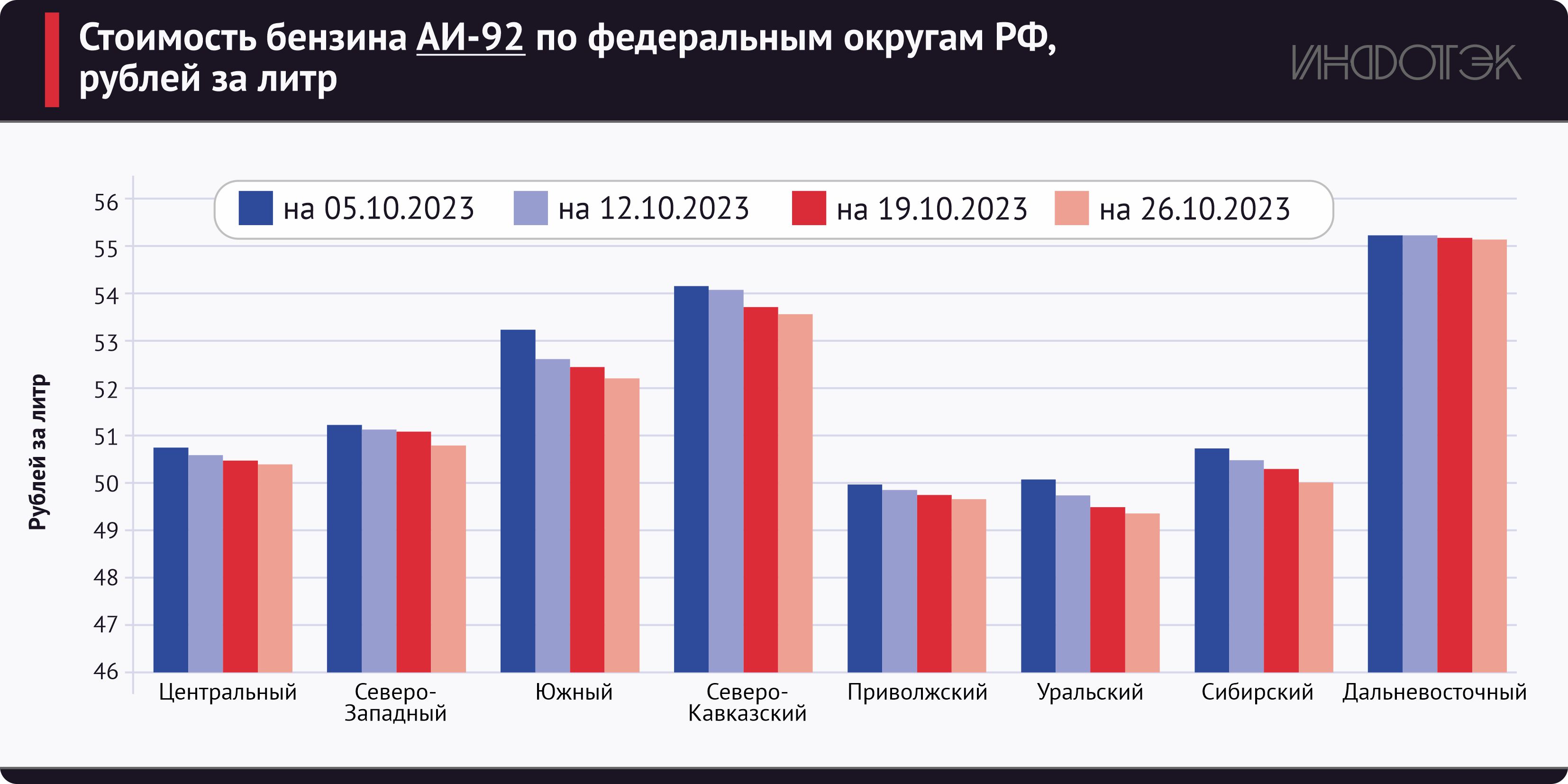 В частности, выделяются регионы, где бензин АИ-92 стоит ниже 50 рублей за литр и где он реализуется значительно дороже. В лидерах по низким ценам остается Приволжский федеральный округ, где на протяжении всего октября АИ-92 в среднем стоил менее 50 рублей за литр.