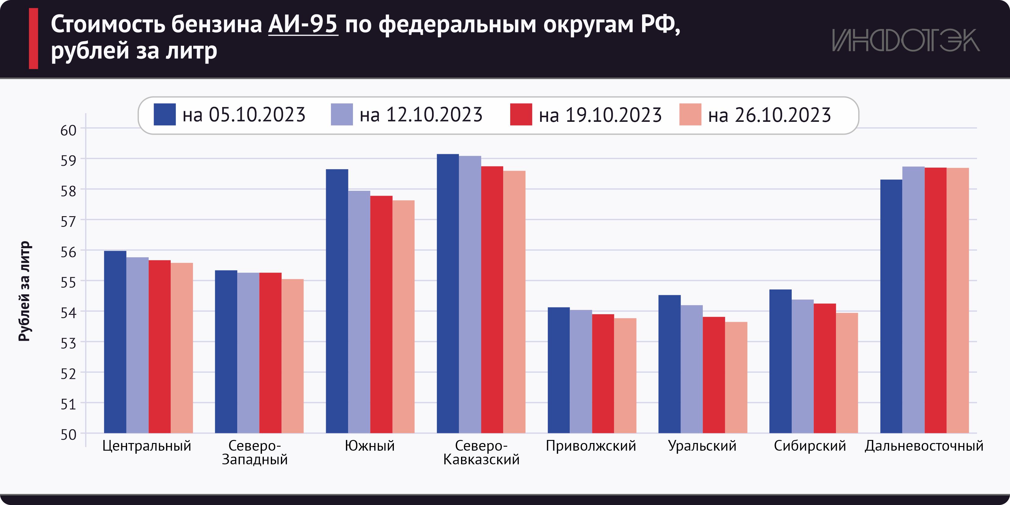 Ко второй неделе месяца в «клуб ниже 50» вступил Уральский федеральный округ, а к концу месяца – и Сибирский ФО. В лидерах по высоким ценам остаются Дальневосточный ФО (что логично из-за высоких затрат на доставку) и Северо-Кавказский ФО. По последнему возникают вопросы, но они скорее находятся в зоне контроля Федеральной антимонопольной службы.Стоимость 95-го бензина по округам колебалась в начале месяца в границах 55–59 рублей за литр, а к концу месяца диапазон расширился до 53–58 рублей за литр. Лидеры те же – Дальний Восток и Северный Кавказ.