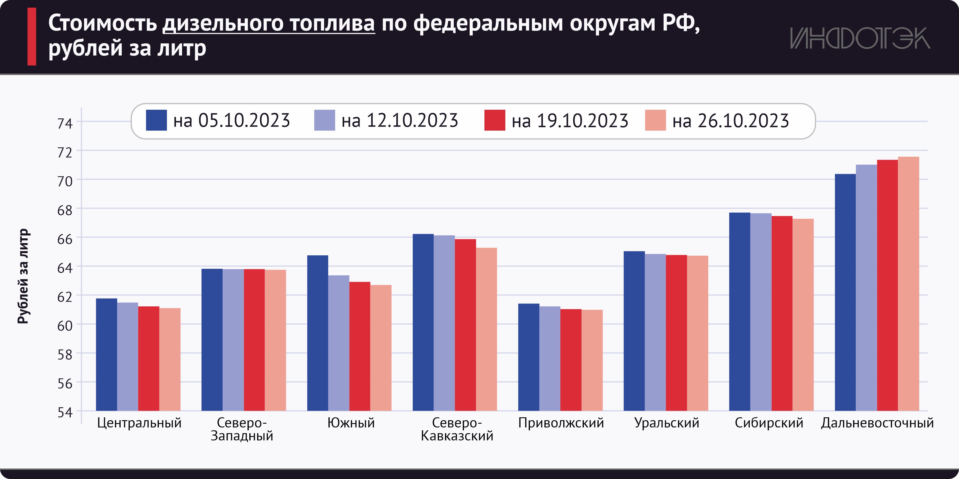 Дизельное топливо в большинстве регионов стоило в диапазоне 60–69 рублей, а на Дальнем Востоке оно перевалило планку 70 рублей и достигало показателя 71,54 рубля за литр. В отличие от других регионов, в ДФО стоимость дизельного топлива росла. Отчасти это связано с более массовым переходом на зимние сорта, отчасти – с логистикой и долгим периодом доставки горючего к местам потребления.