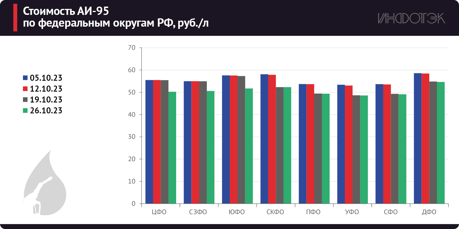 Цены на внутреннем рынке России также демонстрируют снижение (см. рис. 3, 4). Факторов их роста в оптовом звене не наблюдается. До марта 2024 года планируется проводить еженедельные совещания в Министерстве энергетики на тему балансировки рынка. В свою очередь региональные подразделения ФАС осуществляют контроль розничных цен на топливо (ведется работа с каждым продавцом, выходящим за пределы существующих рекомендаций).