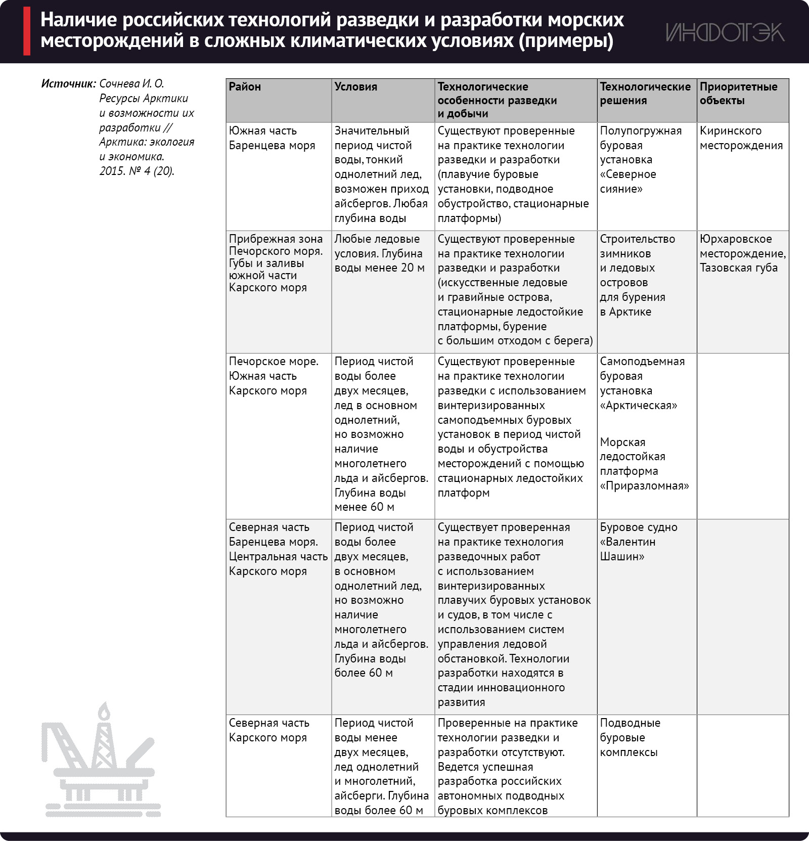 Наряду с этим важно учитывать высокую неоднородность арктических акваторий. Если Баренцево-Карский регион характеризуется относительно благоприятными условиями для проведения геологоразведочных и добычных работ (благодаря теплому течению Гольфстрим), то акватории восточной Арктики обладают экстремальными природно-климатическими условиями (акватория моря открывается для возможного проведения работ по разведке и добыче лишь на короткий период). Такие различия обусловливают различные технологические подходы к освоению месторождений (см. таблицу).