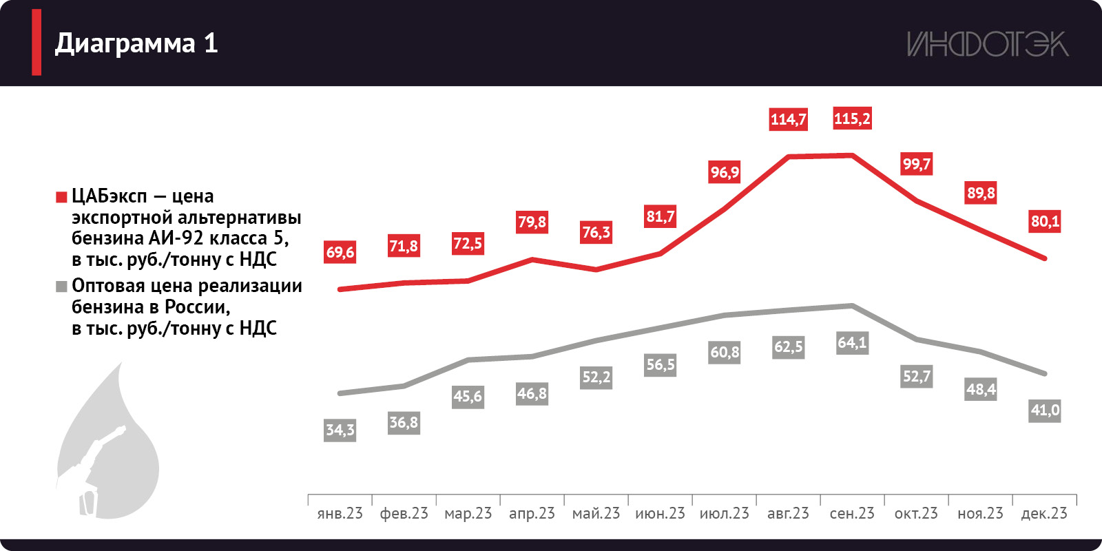 На диаграмме 1 видно, что рост цен на бензин на внутреннем рынке в период "топливного кризиса" в августе-сентябре 2023 года являлся отражением конъюнктуры цен мирового рынка.