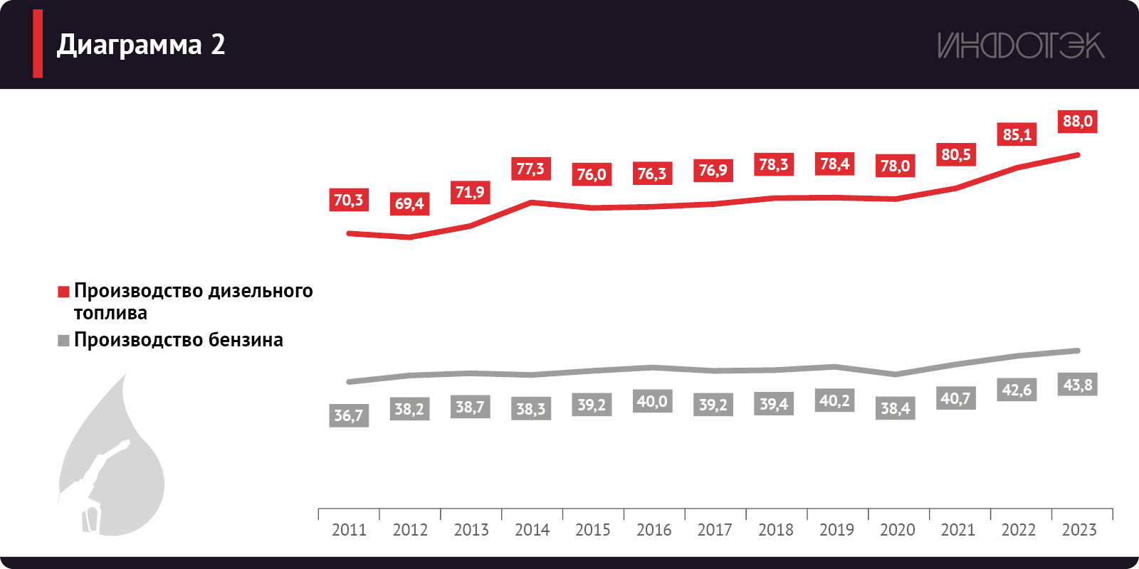 ⎯ производство дизельного топлива до 88 млн т (+3% к уровню 2022 года).