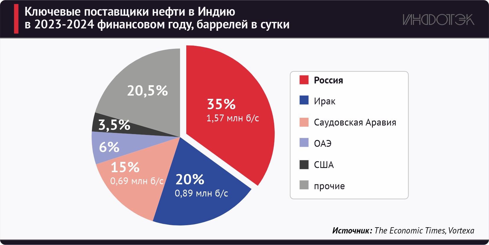 Доля российской нефти в структуре общего импорта Индии в только что завершившемся финансовом году 2023-2024 выросла до 35% против 23% в предыдущем году.