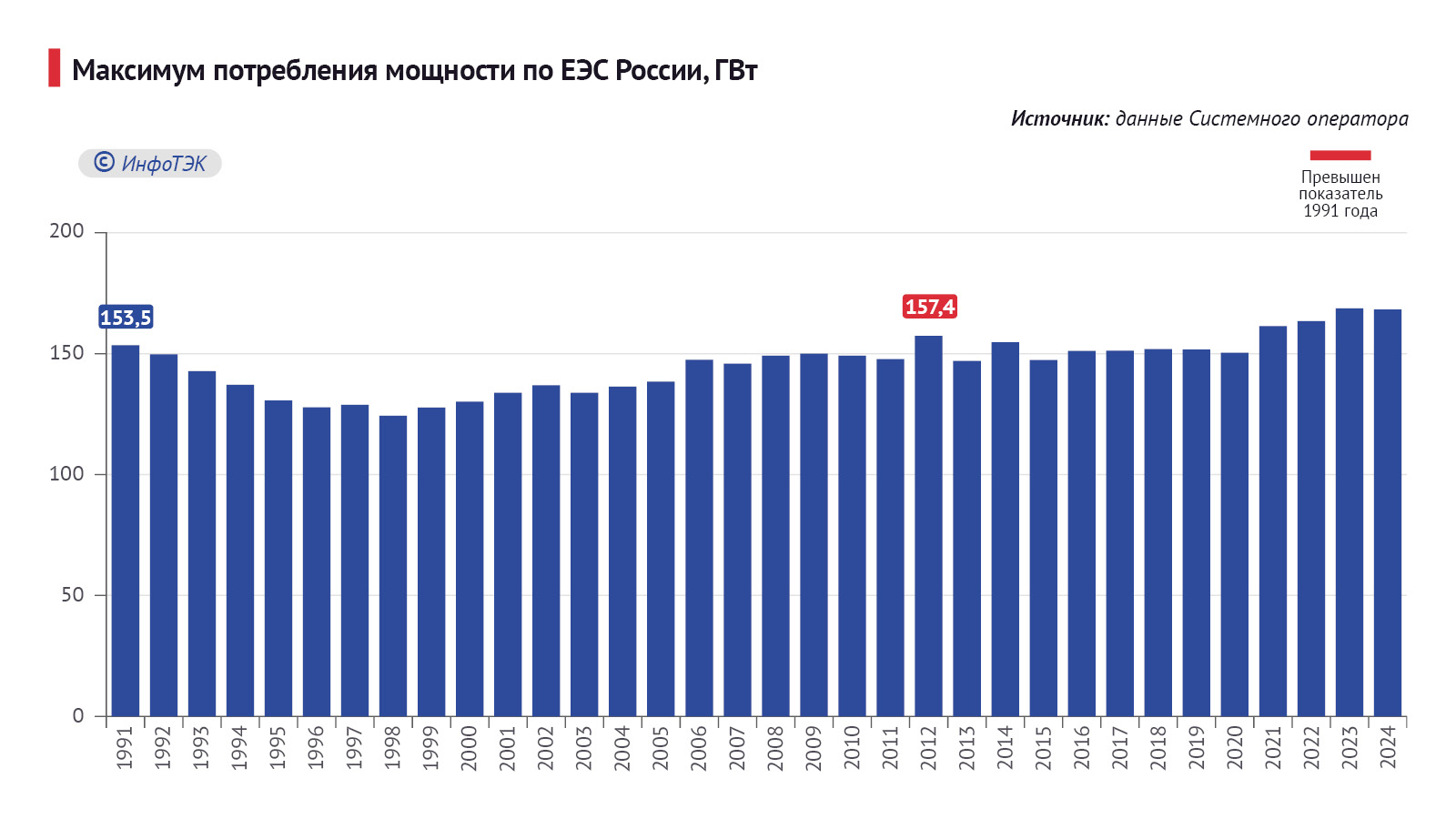 Для сравнения: в 1991 году максимум потребления мощности на территории РФСФСР/РФ зафиксирован на уровне 153,5 ГВт. На тот момент установленная мощность электростанций на территории России составляла 213,3 ГВт (61,3% всех электростанций Единой энергосистемы СССР).