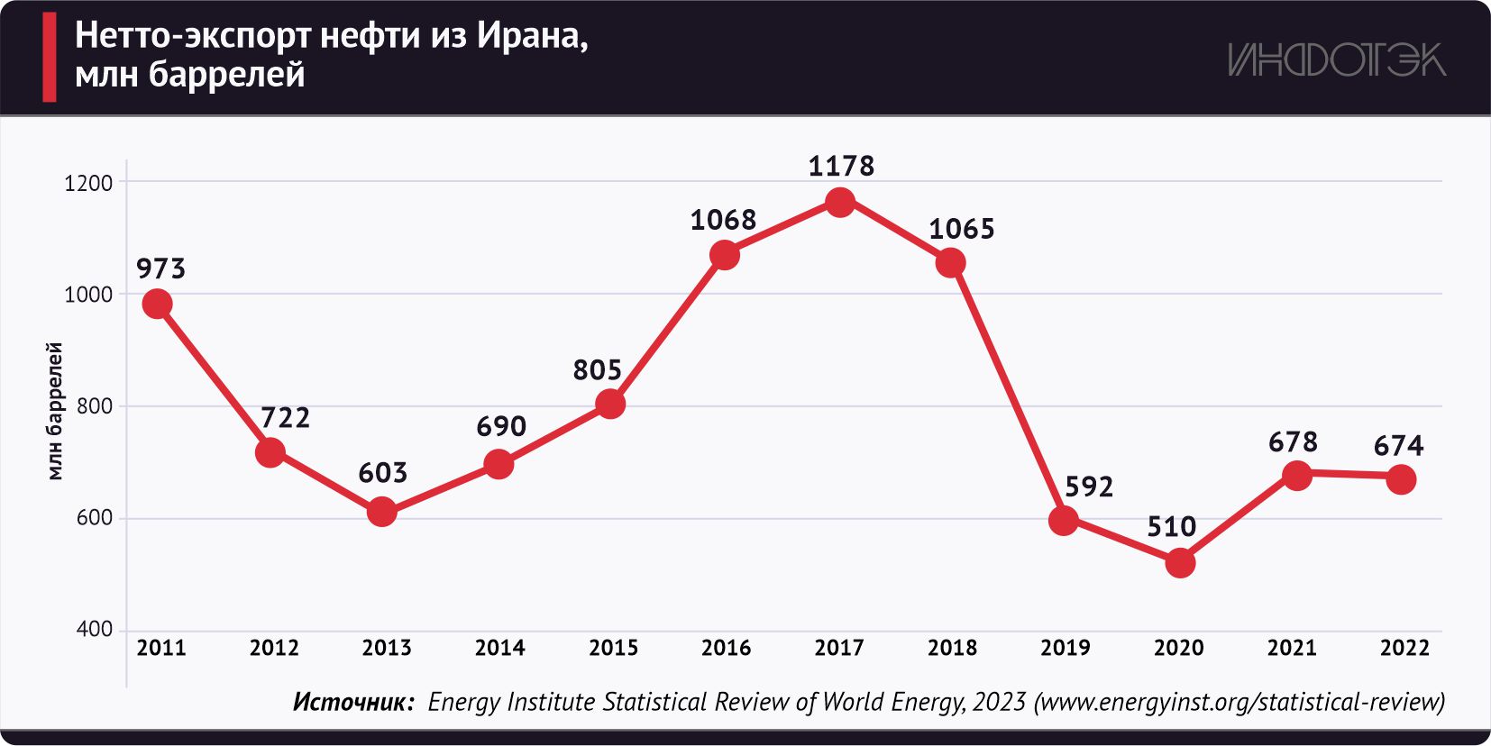 По данным Energy Institute, в 2022 году нетто-экспорт нефти из Ирана составил 674,1 млн баррелей.