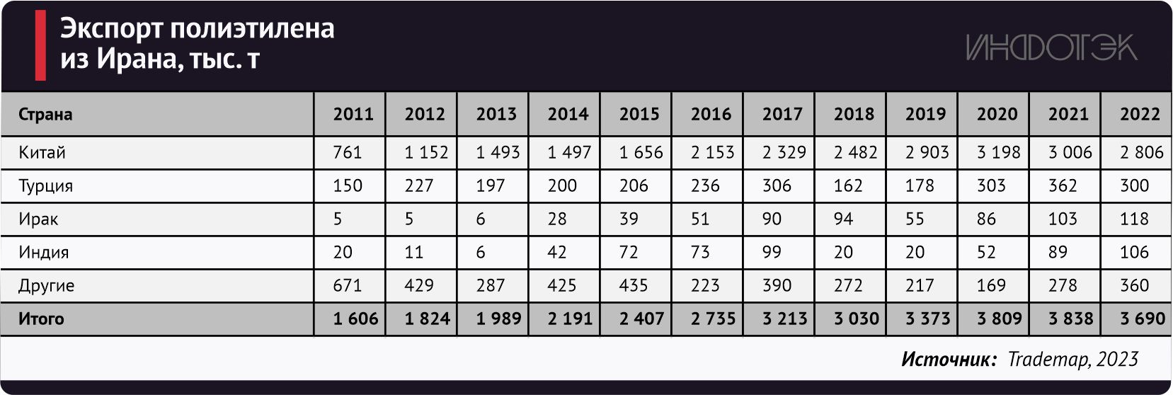 Ключевыми импортерами полиэтилена из Ирана являются Китай (76%), Турция (8%), Ирак (3%) и Индия (3%). За 2022 год Ираном было экспортировано 3 690 тыс. т полиэтилена (-3,9% г./г.). Примечательно, что в денежном эквиваленте экспорт полиэтилена стал четвертым по величине среди всех товарных групп и составил $4,6 млрд.