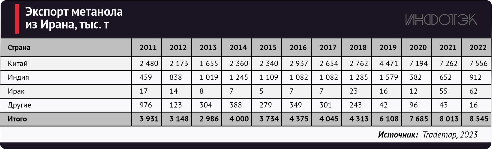 Ключевыми импортерами метанола из Ирана являются Китай (88%), Индия (11%) и Ирак (1%). За 2022 год Ираном было экспортировано 8 545 тыс. т метанола (+6,6% г./г.). В денежном эквиваленте экспорт метанола составил $2,4 млрд.
