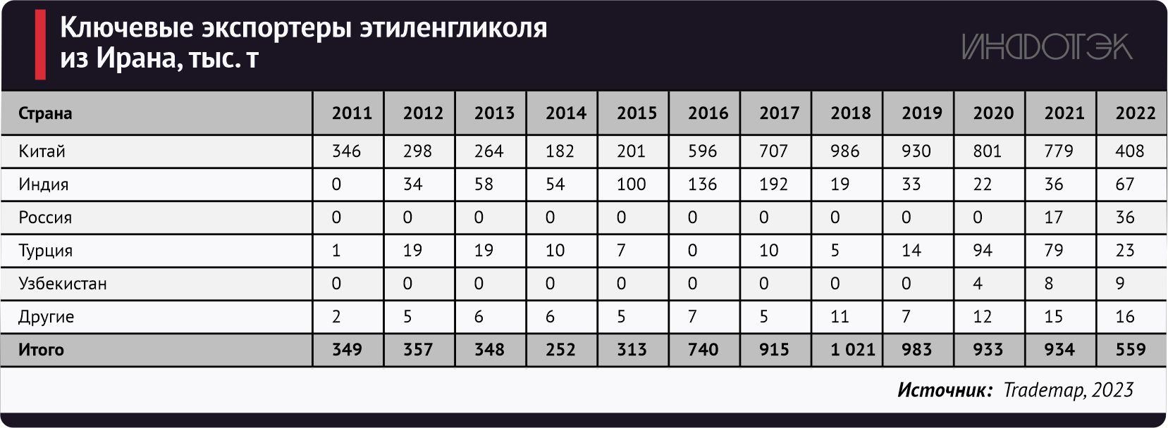 Ключевыми импортерами этиленгликоля из Ирана являются Китай (73%), Индия (12%) и Россия (6%), Турция (4%) и Узбекистан (2%). За 2022 год Ираном было экспортировано 559 тыс. т этиленгликоля (-67% г./г.).