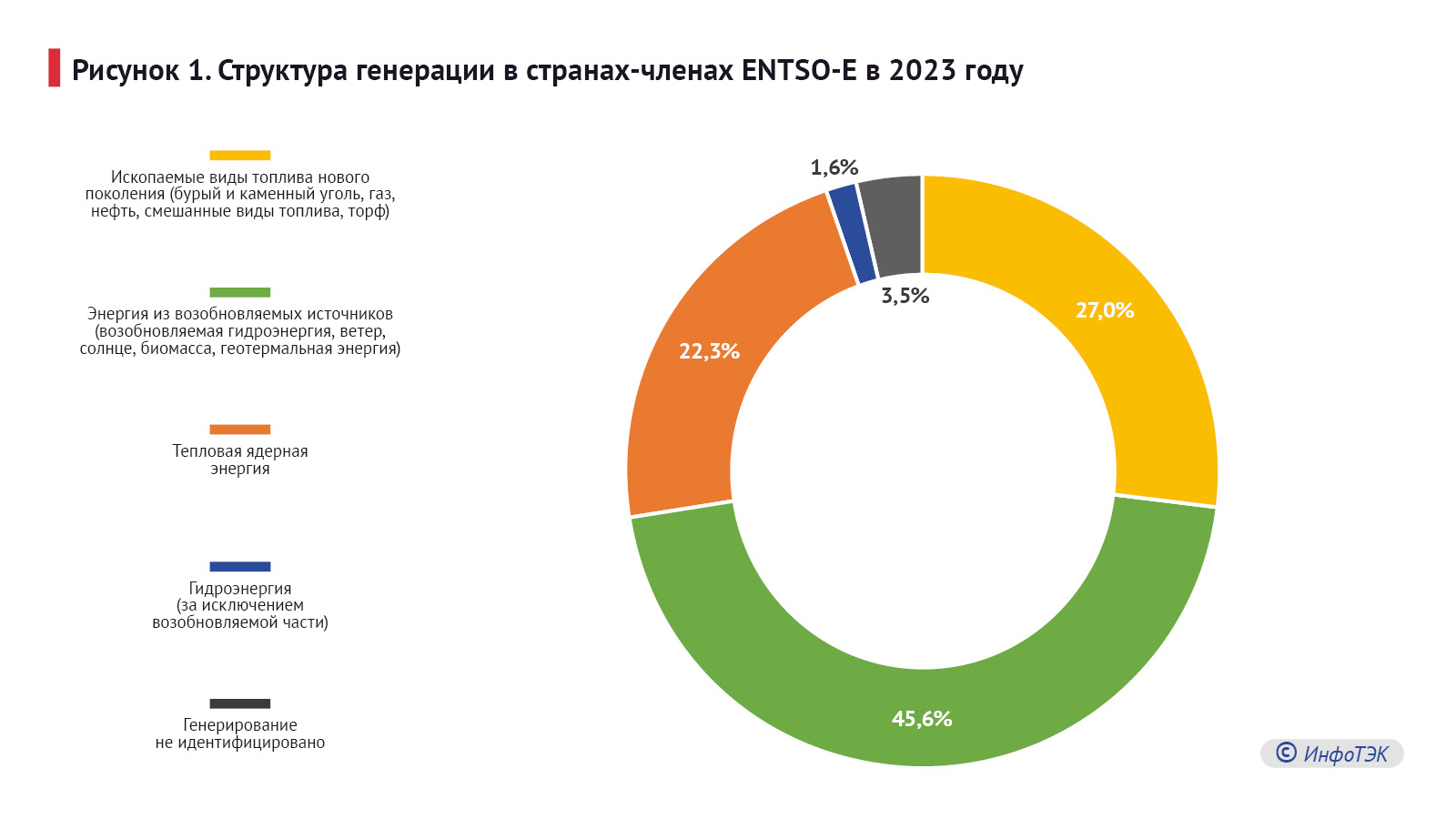 Согласно данным Европейской сети операторов систем передачи электроэнергии (ENSTO-E) за 2023 год, в 38 европейских странах около половины общей выработки электроэнергии приходится на атомные и тепловые электростанции, сжигающие газ и уголь. Основные мощности сконцентрированы в Германии и Франции, которые также являются крупнейшими потребителями электроэнергии в Европе.