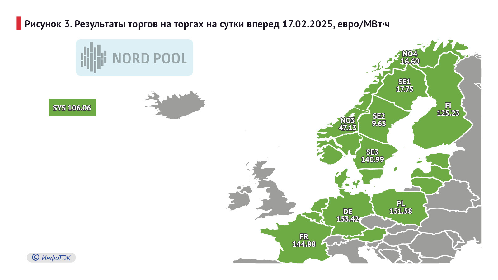 При этом на основе заявок на продажу и покупку без учета доступной пропускной способности между зонами рассчитывается системная цена — это базовая цена в Северной Европе для торговли и клиринга большинства финансовых контрактов.
