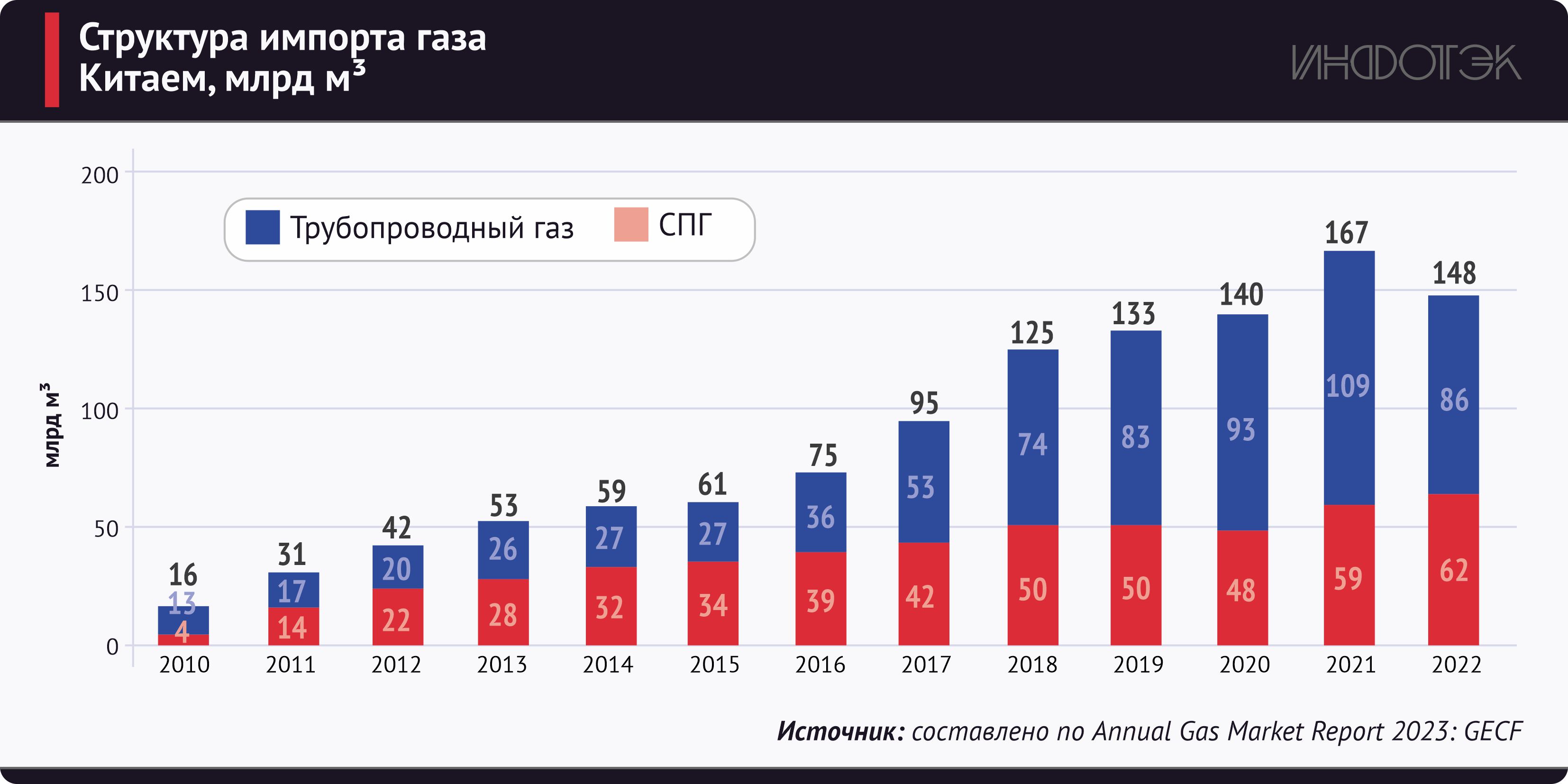 В 2022 году объем импорта газа Китаем составил 147,8 млрд куб. м (см. рис. 1), в том числе 85,7 млрд куб. м (58,0%) составили поставки СПГ и 62,1 млрд куб. м (52,0%) – трубопроводного газа.