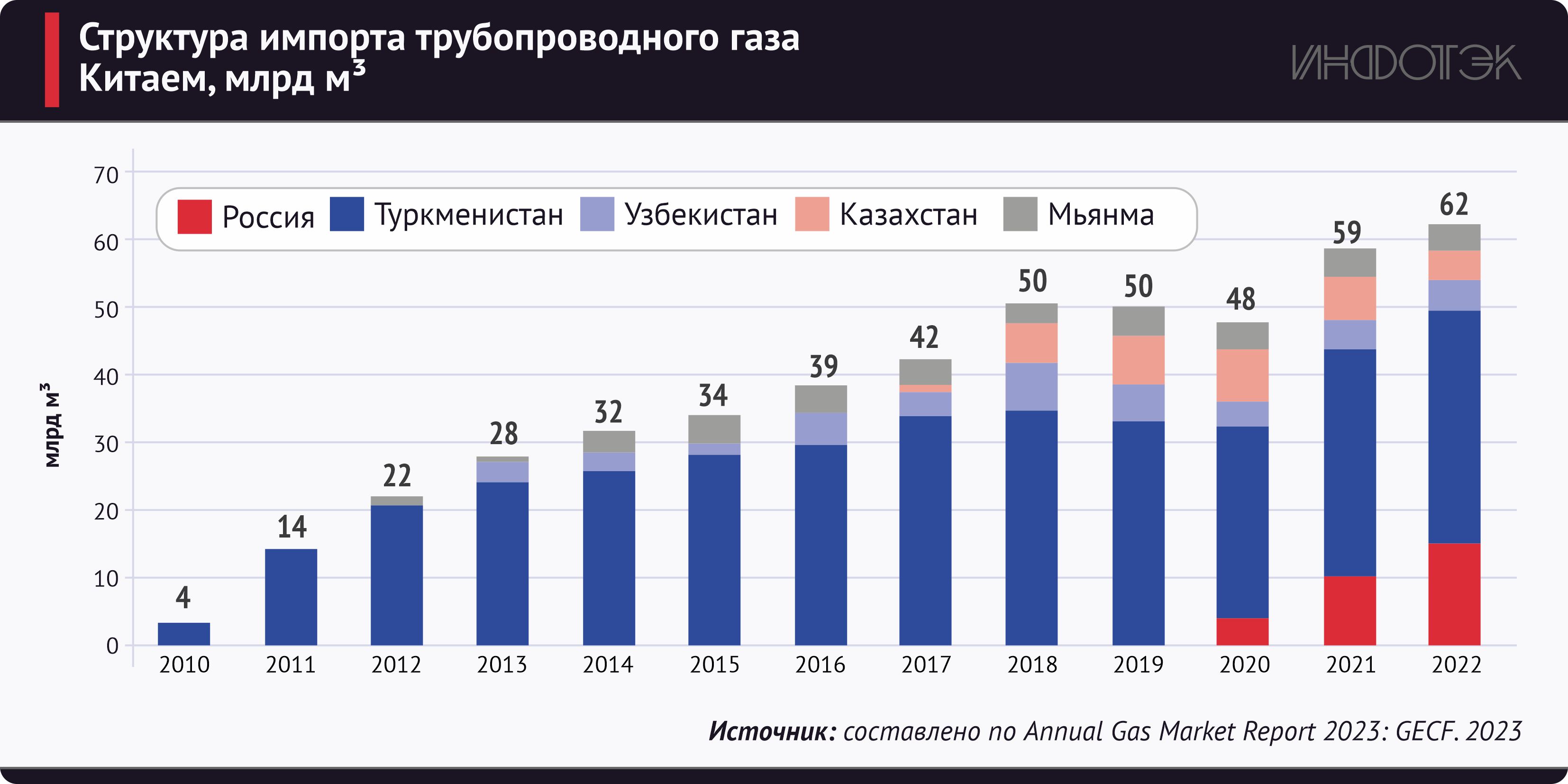 Поставки трубопроводного газа в Китай (см. рис. 2) осуществляются из Туркменистана, Узбекистана и Казахстана по сетевому газопроводу Центральная Азия – Китай (в 2022 году – около 45,8 млрд куб. м). С 2013 года импорт также начал идти из Мьянмы по газопроводу пропускной способностью 13 млрд куб. м. Участниками проекта по строительству данного газопровода являлись компании CNPC, MOGE, Daewoo International, KOGAS, Indian Oil и GAIL. В 2022 году из Мьянмы в Китай было экспортировано 3,8 млрд куб. м, что на 9,5% меньше, чем в предыдущем году.